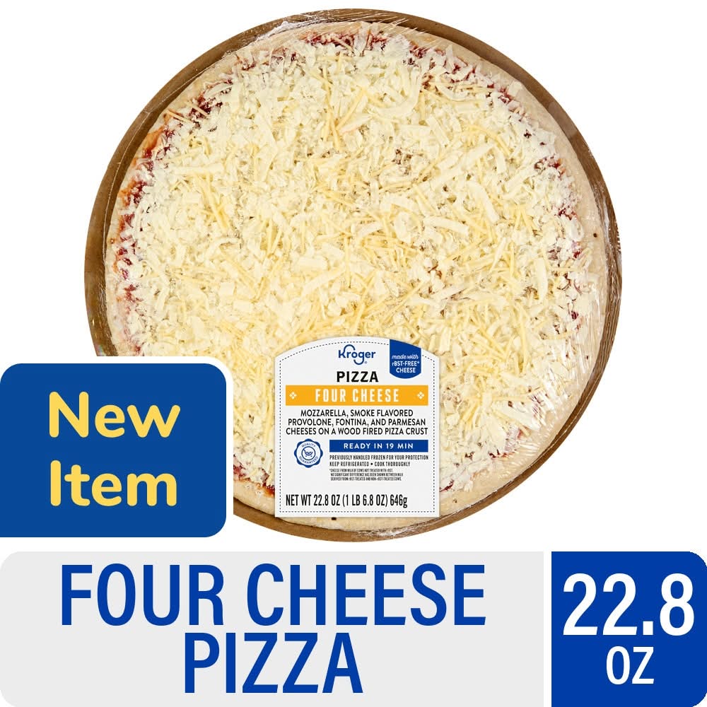 Kroger® Four Cheese Pizza is a treat for your taste buds! Packed with bold mozzarella, smoky Provolone, creamy Fontina, and savory Parmesan cheeses on a wood fired pizza crust for a tasty treat! It's great for lunch, dinner, or a delicious snack. Ready in 19 minutes, it's easy to bake and fun to eat. Kroger® products are tried, tested and loved by you - quality guaranteed.22.8 oz Package of Kroger® Four Cheese PizzaToppings include mozzarella, smoke flavored Provolone, Fontina, and Parmesan cheeses on a wood fired pizza crustEasy to bake in the oven and ready in 19 minutes for a quick mealMade with rBST-free cheeseˆKroger® quality you can trustˆCheese from cows not treated with rBST. No significant difference has been shown between milk derived from rBST-treated and non-rBST-treated cows Size: 22.8 oz