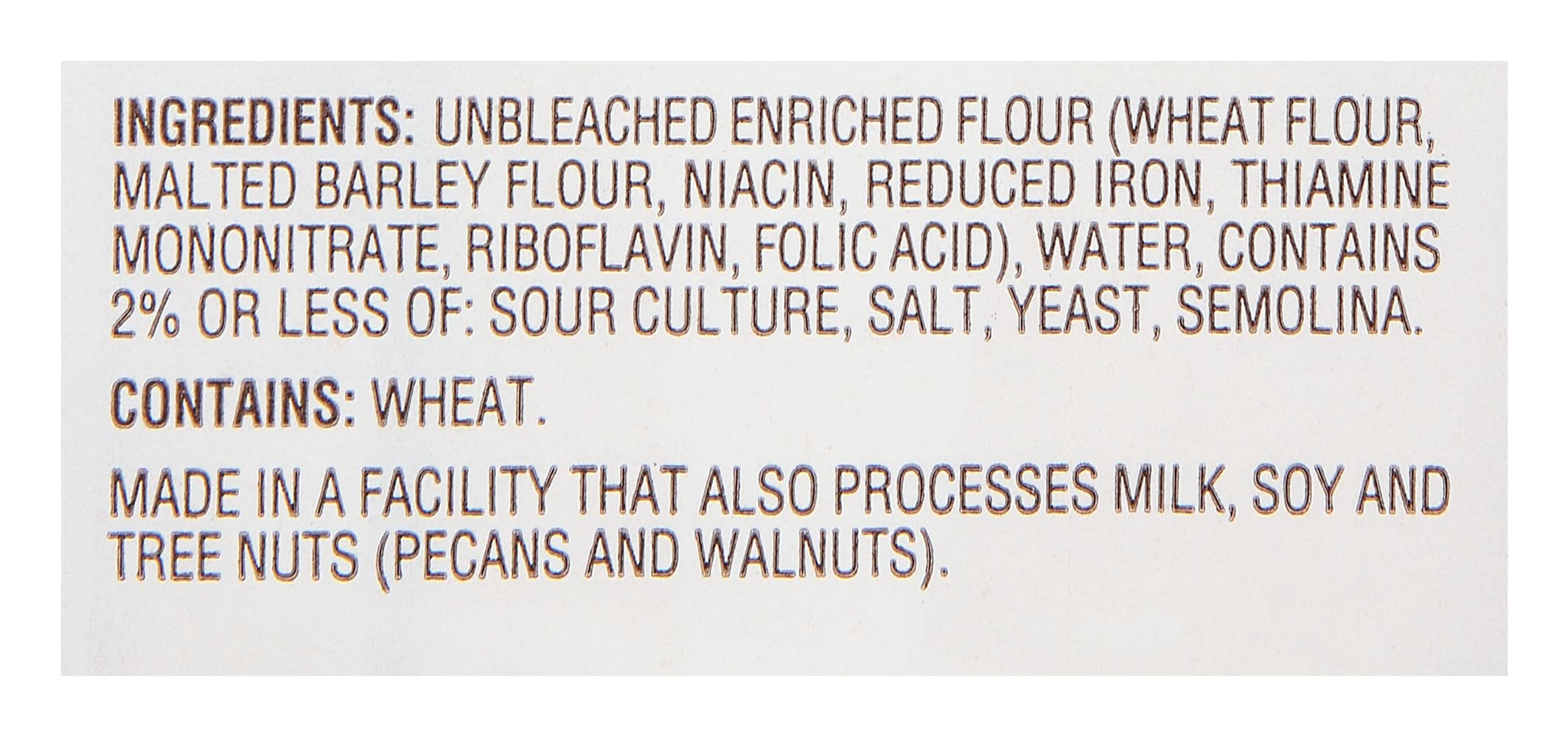 Ingredients: Unbleached Enriched Flour (Wheat Flour, Malted Barley Flour, Niacin, Reduced Iron, Thiamine Mononitrate, Riboflavin, Folic Acid), Water, Contains 2% or Less of: Sour Culture, Salt, Yeast, Semolina Contains: Wheat, Milk, Soybeans, Tree Nuts