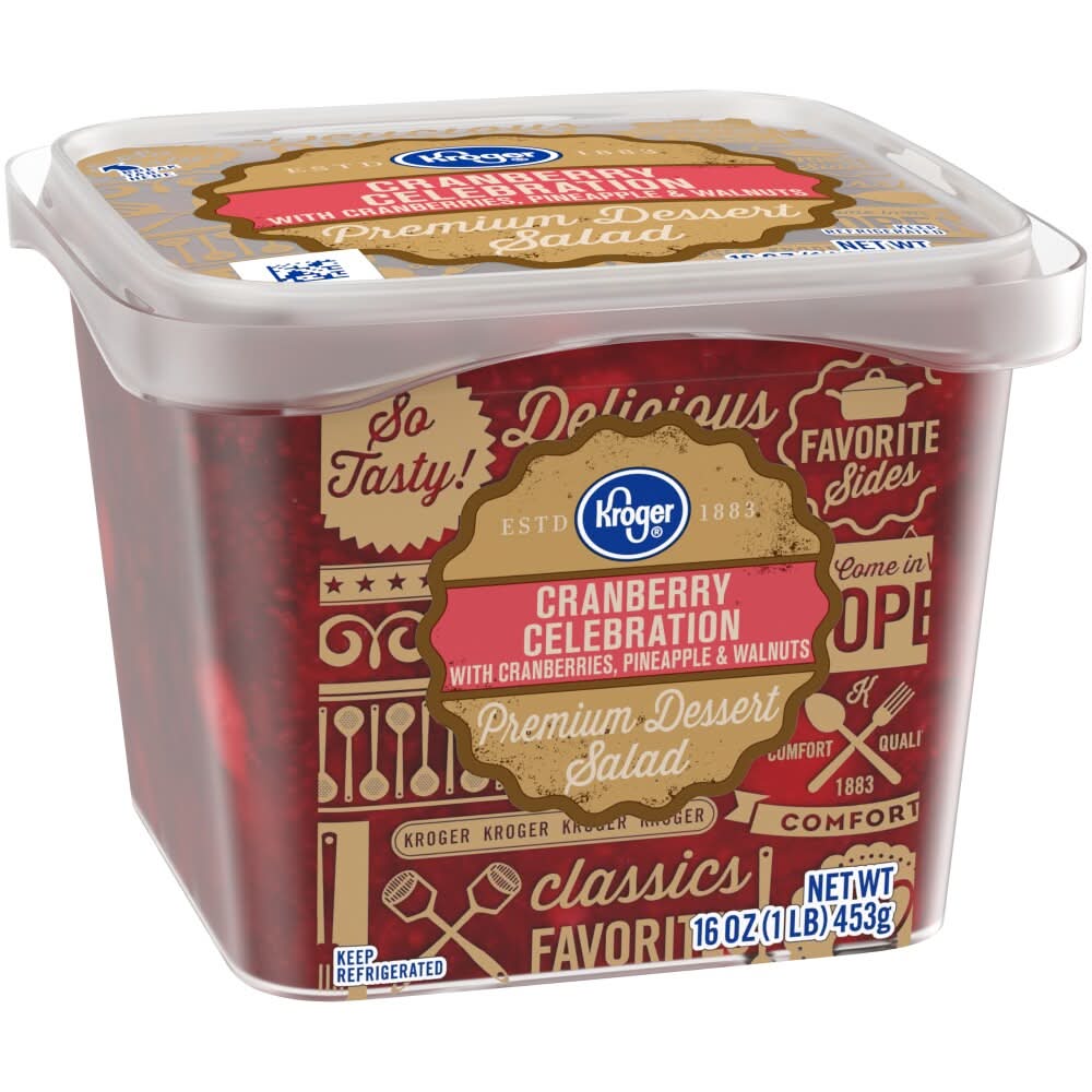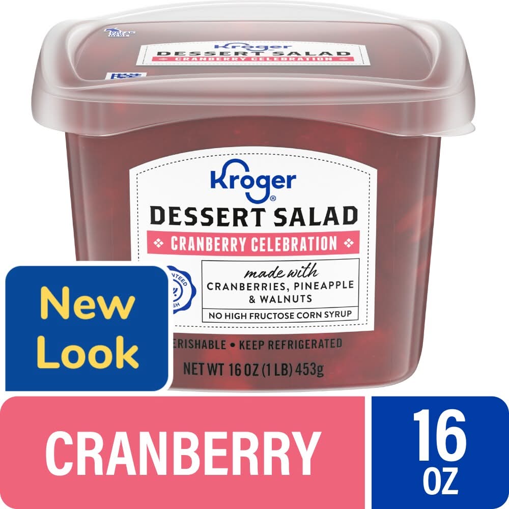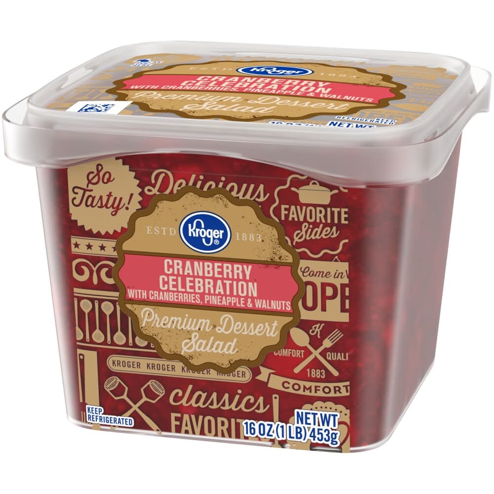 Kroger Cranberry Celebration Dessert Salad bursts with the tartness of cranberries and the sweet juiciness of pineapple. Crunchy walnuts and celery add a fun, satisfying texture. This fun salad is a delicious complement for any meal. It delivers a premium dessert experience to delight your taste buds every time. Size: 16 oz
