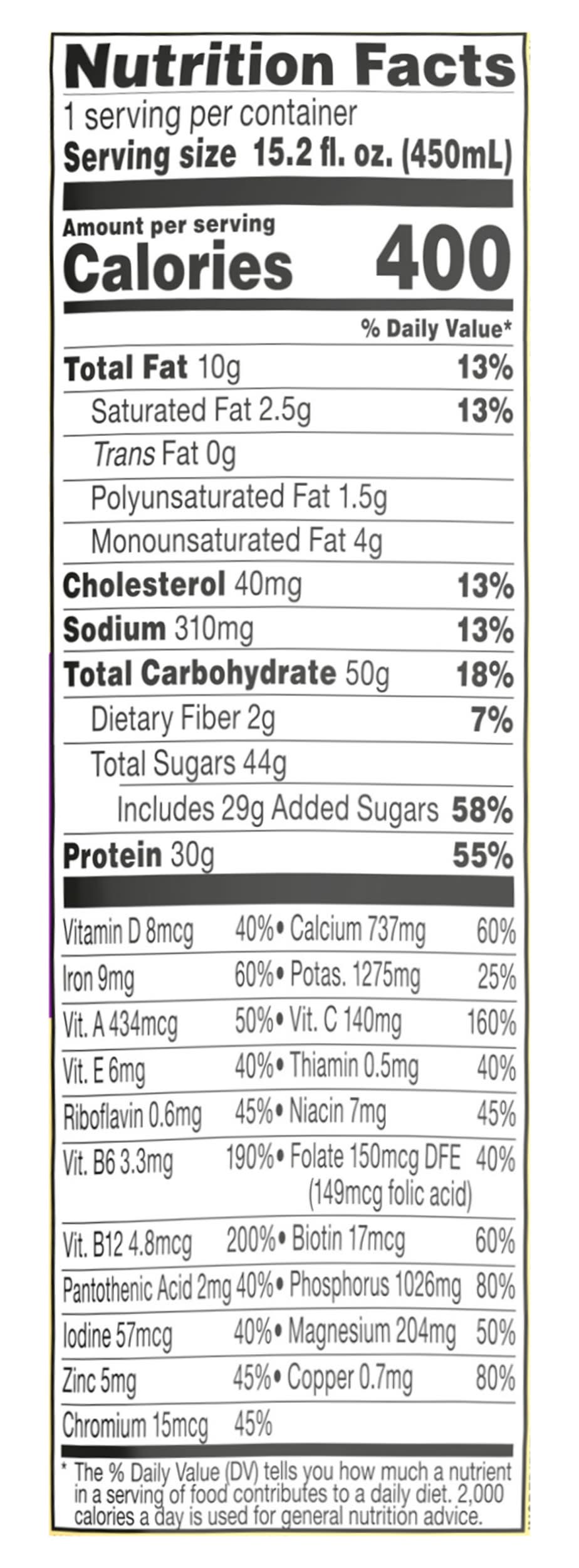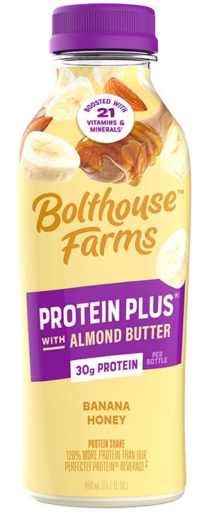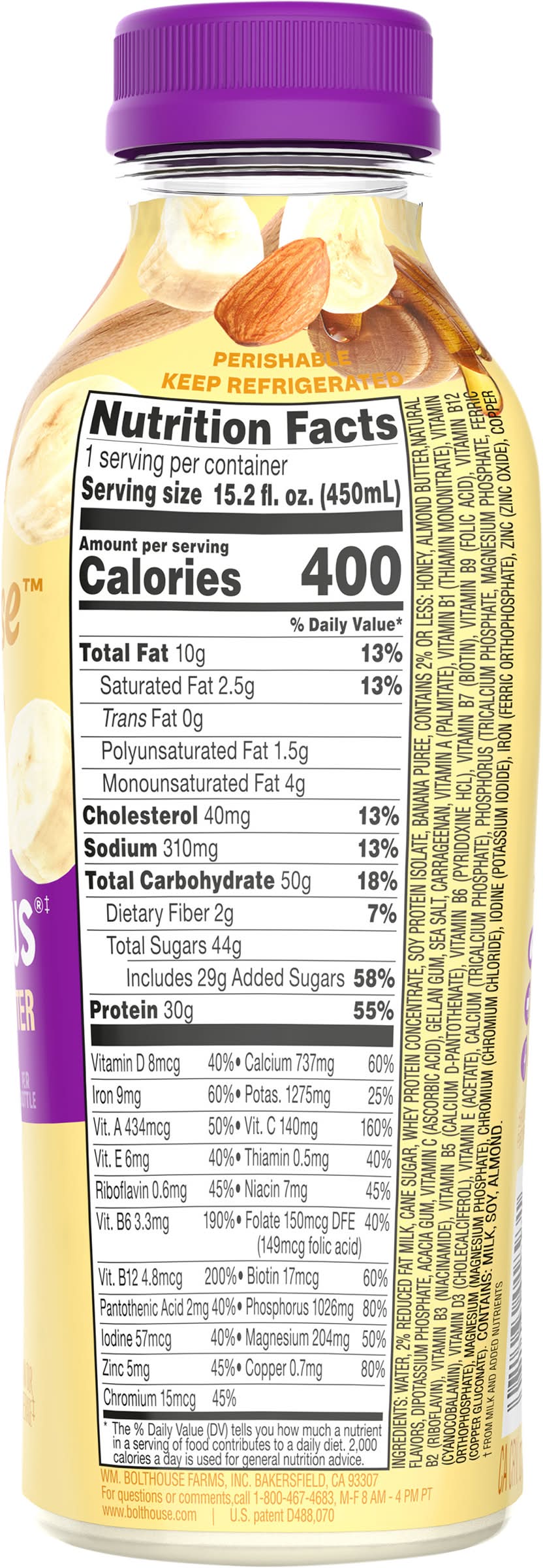 Creamy banana, sweet natural honey, and rich almond butter, together in perfect proportions. We've promised to use fewer ingredients that people don't want and more of the ones they do.30g of Protein21 Vitamins and Minerals • Flavor: Banana honey • Size: 15.2 fl oz • WM. Bolthouse Farms, Inc., Bakersfield, CA, 93307 • Packaging: Reusable