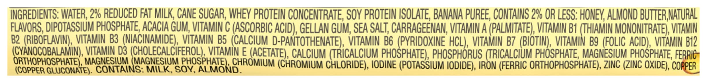 Ingredients: Water, Reduced Fat Milk, Cane Sugar, Whey Protein Concentrate, Soy Protein Isolate, Banana Puree, Almond Butter, Honey, Contains 1% Or Less: Natural Flavors, Dipotassium Phosphate, Acacia Gum, Coconut Water Concentrate, Vitamin C (Ascorbic Acid), Gellan Gum, Sea Salt, Carrageenan, Vitamin A (Palmitate), Vitamin B1 (Thiamin Mononitrate), Vitamin B2 (Riboflavin), Vitamin B3 (Niacinamide), Vitamin B5 (Calcium D-Pantothenate), Vitamin B6 (Pyridoxine Hcl), Vitamin B7 (Biotin), Vitamin B9 (Folic Acid), Vitamin B12 (Cyanocobalamin), Vitamin D3 (Cholecalciferol), Vitamin E (Dl-Alpha Tocopheryl Acetate), Calcium (Tricalcium Phosphate), Phosphorus (Tricalcium Phosphate, Magnesium Phosphate), Magnesium (Magnesium Phosphate), Chromium (Chromium Chloride), Iodine (Potassium Iodide), Iron (Ferric Orthophosphate), Zinc (Zinc Oxide), Copper (Copper Gluconate) Contains: Contains: Milk, Soy, Coconut, Almonds