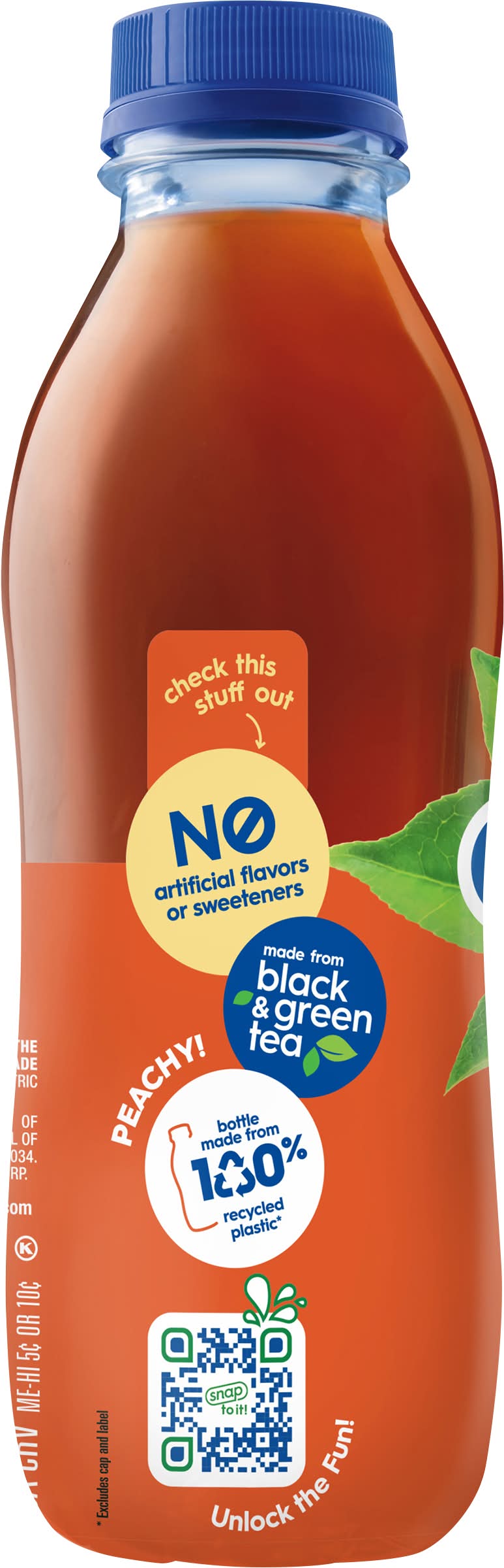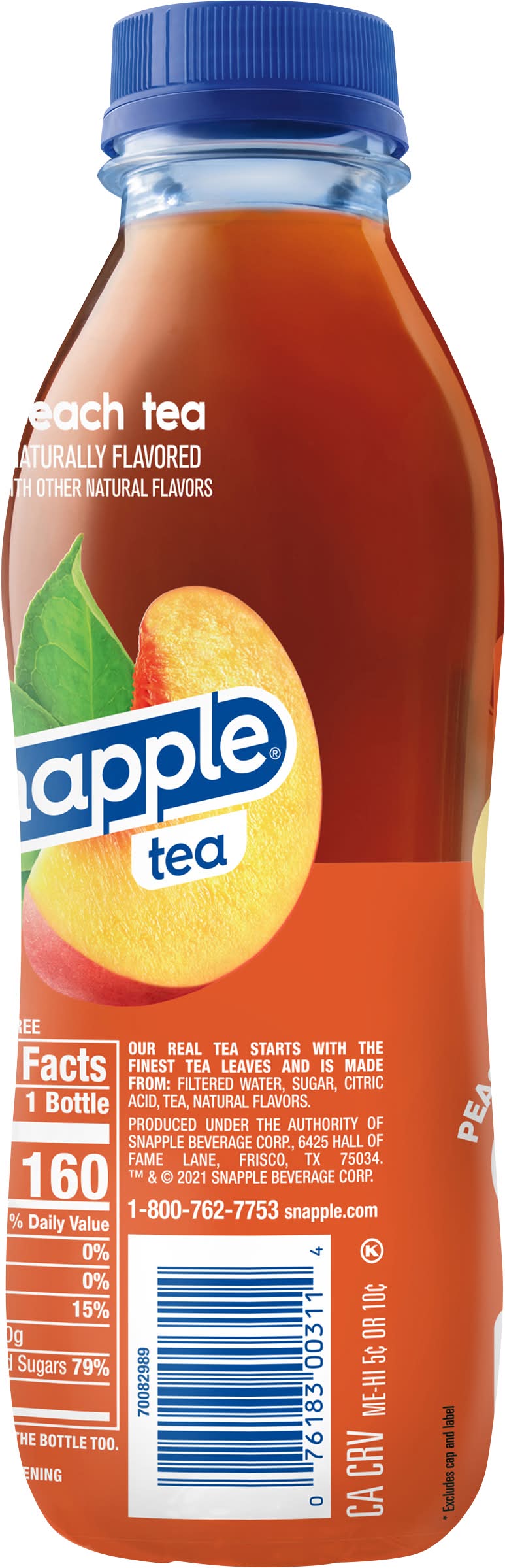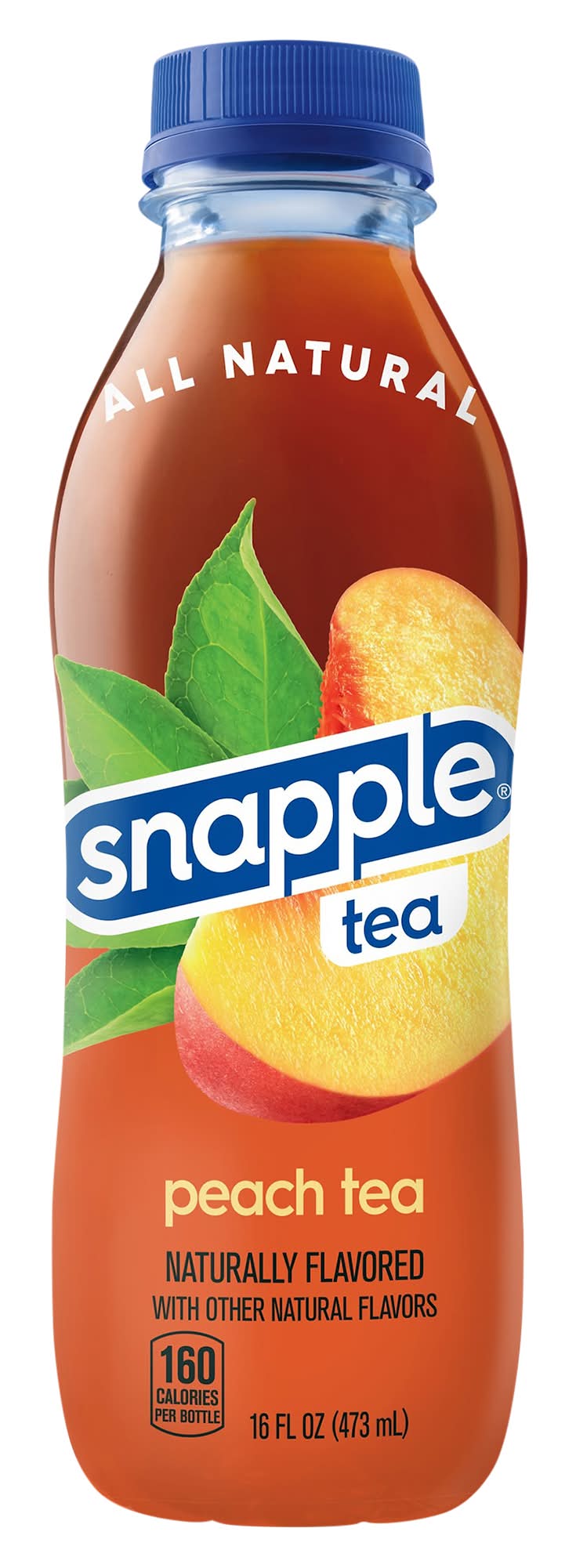 It is naturally flavored, without any artificial sweeteners or flavors, and is gluten-free. The drink is presented in an eco-friendly bottle made from 100% recycled plastic, excluding the cap and label, which uses 80% less material compared to Snapple's previous glass bottles. • Flavor: Peach • Size: 16 fl oz • Packaging: Reusable