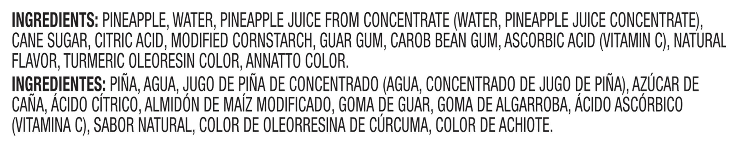 Ingredients: Pineapple Juice from Concentrate (Water Pineapple Juice Concentrate), Water, Pineapple, Cane Sugar, Citric Acid, Modified Corn Starch, Guar Gum, Carob Bean Gum, Ascorbic Acid (Vitamin C), Natural Flavor, Turmeric Oleoresin Color, Annatto Color Contains: Corn