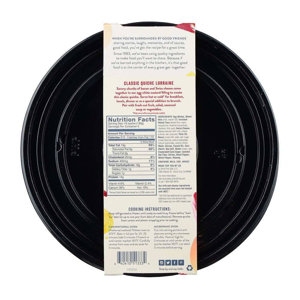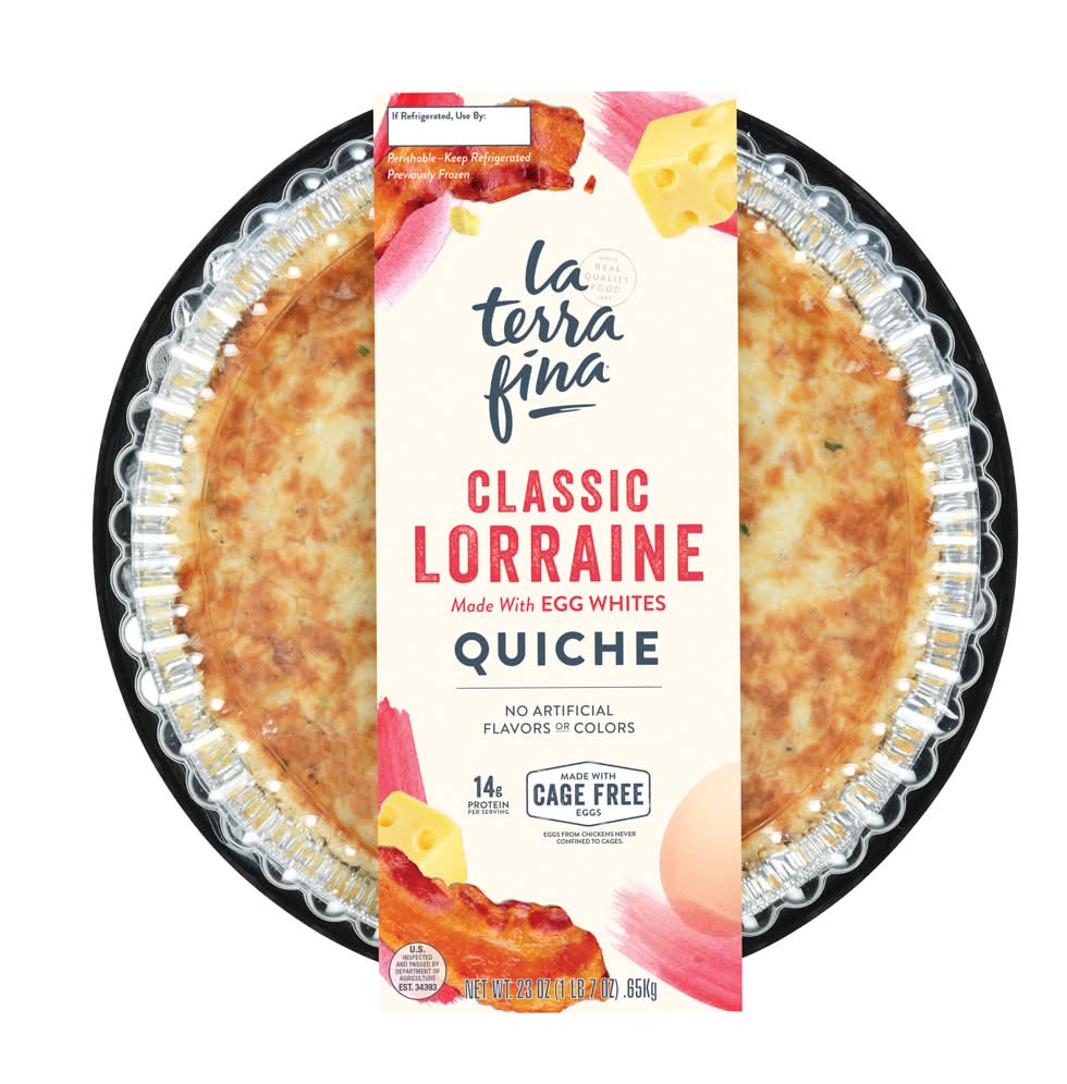 La Terra Fina Classic Lorraine Quiche features a savory blend of bacon and Swiss cheese nestled in an egg white custard filling. It offers a satisfying 14 grams of protein per serving and is crafted without artificial flavors or colors. Ideal for any meal or as a delightful addition to brunch, it can be enjoyed hot or cold after initial cooking. This quiche is made with cage-free eggs and dairy ingredients from cows not treated with rBST, with no significant difference from milk derived from rBST-treated cows. It is also U.S. inspected and passed by the Department of Agriculture and was previously frozen to maintain freshness. • Size: 23 oz • La Terra Fina USA, LLC, 1300 Atlantic St.,Union City,CA,94587 • Packaging: Reusable