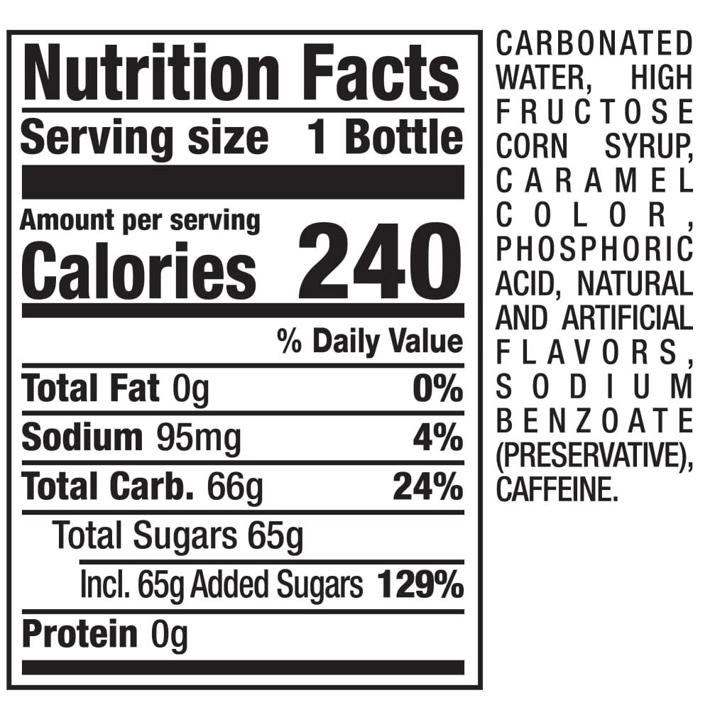Ingredients: Carbonated Water, High Fructose Corn Syrup, Caramel Color, Phosphoric Acid, Natural and Artificial Flavors, Sodium Benzoate Preservative, Caffeine Contains: Caffeine