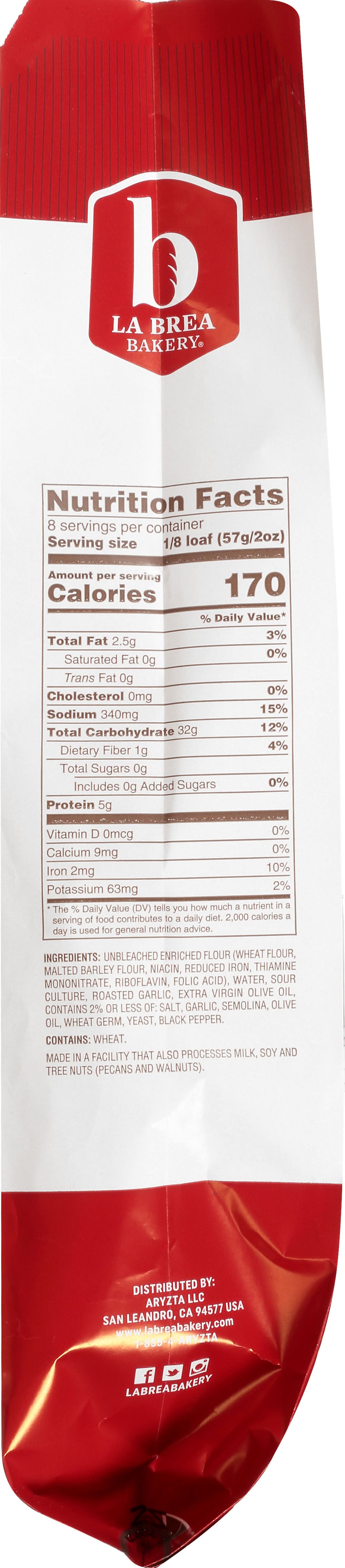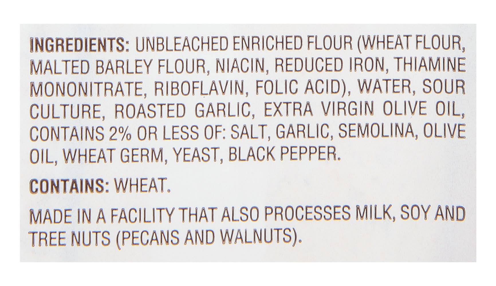 Ingredients: Unbleached Enriched Flour (Wheat Flour, Malted Barley Flour, Niacin, Reduced Iron, Thiamine Mononitrate, Riboflavin, Folic Acid), Water, Sour Culture, Roasted Garlic, Extra Virgin Olive Oil, Contains 2% or Less of: Salt, Garlic, Semolina, Olive Oil, Wheat Germ, Yeast, Black Pepper Contains: Wheat, Milk, Soybeans, Tree nuts