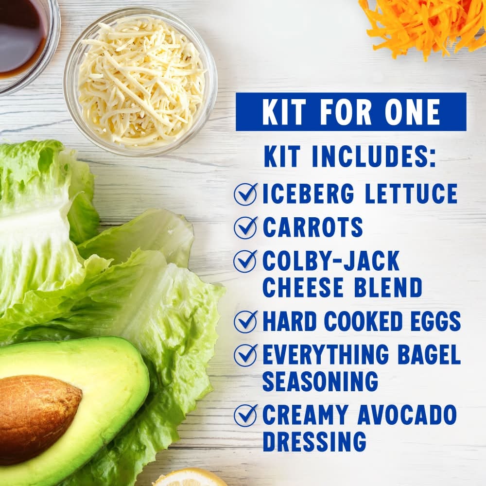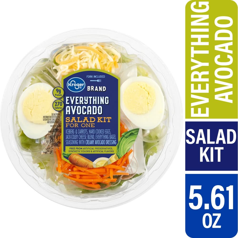 Kroger® Everything Avocado Salad Kit jazzes up mealtime! This mix includes crisp iceberg and carrots, hard cooked eggs, and a delicious Jack-Colby cheese blend. Toss in avocado ranch dressing and sprinkled with everything bagel seasoning, and every bite brings joy. Don't forget, each serving has 9g protein and 270 calories and is ready to enjoy! Fork included.Kroger® products are tried, tested and loved by you - quality guaranteed.5.61 oz Bowl of Kroger® Everything Avocado Salad KitReady to enjoy with minimal meal prep timeContains 270 calories and 9g of protein per servingFree from artificial preservatives, synthetic colors & artificial flavorsKroger® quality you can trust Size: 5.61 oz