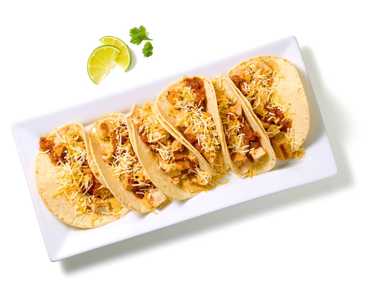 White meat chicken, flour and white corn blend tortillas, Monterrey Jack and cheddar cheese blend, chipotle crema and Diego salsa. Makes six tacos.