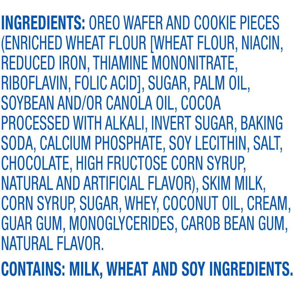 Ingredients: OREO WAFER AND COOKIE PIECES (ENRICHED WHEAT FLOUR [WHEAT FLOUR, NIACIN, REDUCED IRON, THIAMINE MONONITRATE, RIBOFLAVIN, FOLIC ACID], SUGAR, PALM OIL, SOYBEAN AND/OR CANOLA OIL, COCOA PROCESSED WITH ALKALI, INVERT SUGAR, BAKING SODA, CALCIUM PHOSPHATE, SOY LECITHIN, SALT, CHOCOLATE, HIGH FRUCTOSE CORN SYRUP, NATURAL AND ARTIFICIAL FLAVOR), SKIM MILK, CORN SYRUP, SUGAR, WHEY, COCONUT OIL, CREAM, GUAR GUM, MONOGLYCERIDES, CAROB BEAN GUM, NATURAL FLAVOR. Contains: Milk, Wheat, Soybeans, Tree Nuts