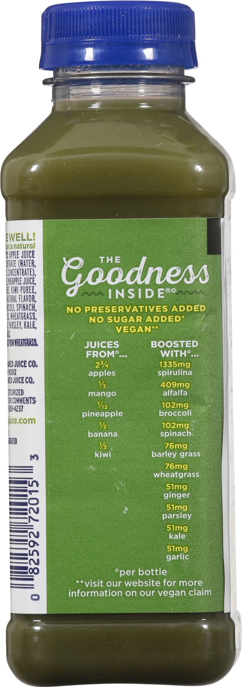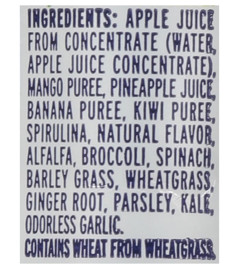 Ingredients: Apple Juice from Concentrate (Water, Apple Juice Concentrate), Mango Puree, Pineapple Juice, Banana Puree, Kiwi Puree, Spirulina, Natural Flavor, Alfalfa, Broccoli, Spinach, Barley Grass, Wheatgrass, Ginger Root, Parsley, Kale, Odorless Garlic Contains: Wheat, Barley
