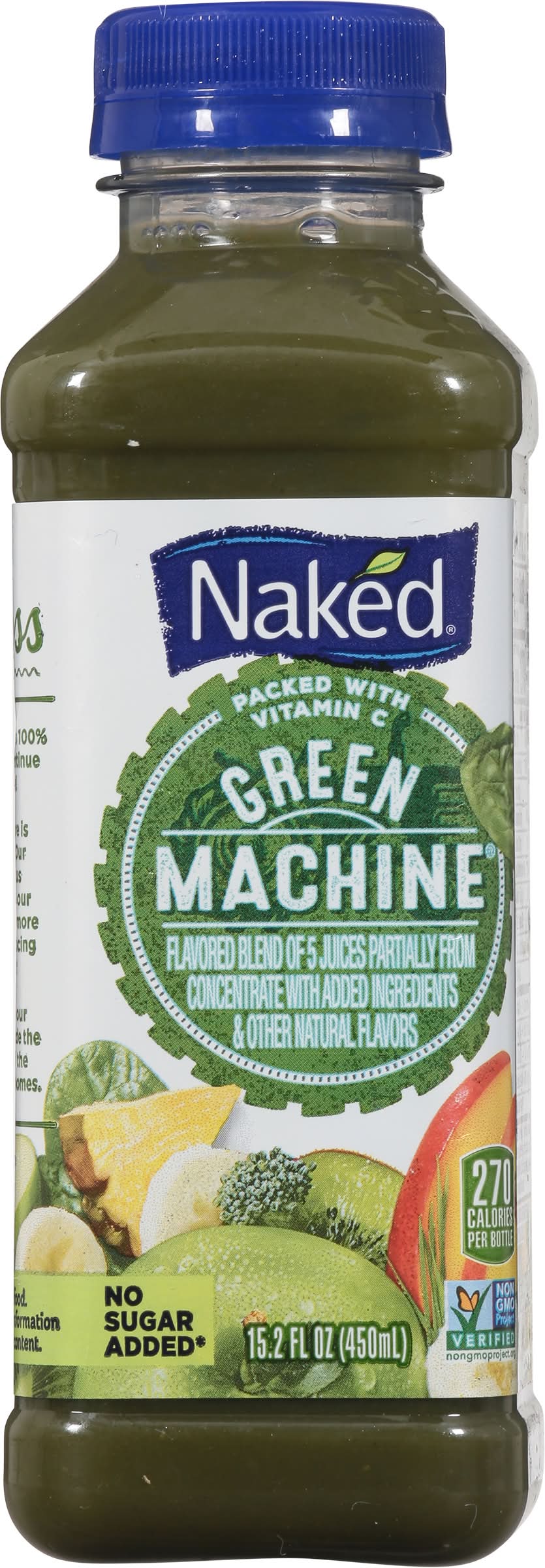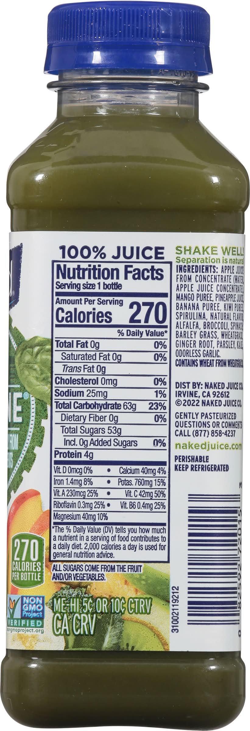 Fiber & 6 essential vitamins & minerals 240 cals° The Goodness Inside Juices from 3/5 kiwi 1/3 mango 3 4/5 apples 1/2 banana Boosted with 441mg alfalfa 110mg broccoli 55mg garlic 55mg ginger root 55mg kale 55mg parsley 110mg spinach 1433mg spirulina Fun facts Not a low calorie food. Per bottle Get a boost with Naked! From slingin' our smoothies to locals in Santa Monica to servin' up coast to coast, we've always strived to help you live your best life. With the perfect blend of real fruits & veggies, boosted with vitamins and nutrients, this smoothie satisfies whenever snack time hits you. 6g fiber • Flavor: Green machine • Size: 15.2 fl oz • Packaging: Reusable