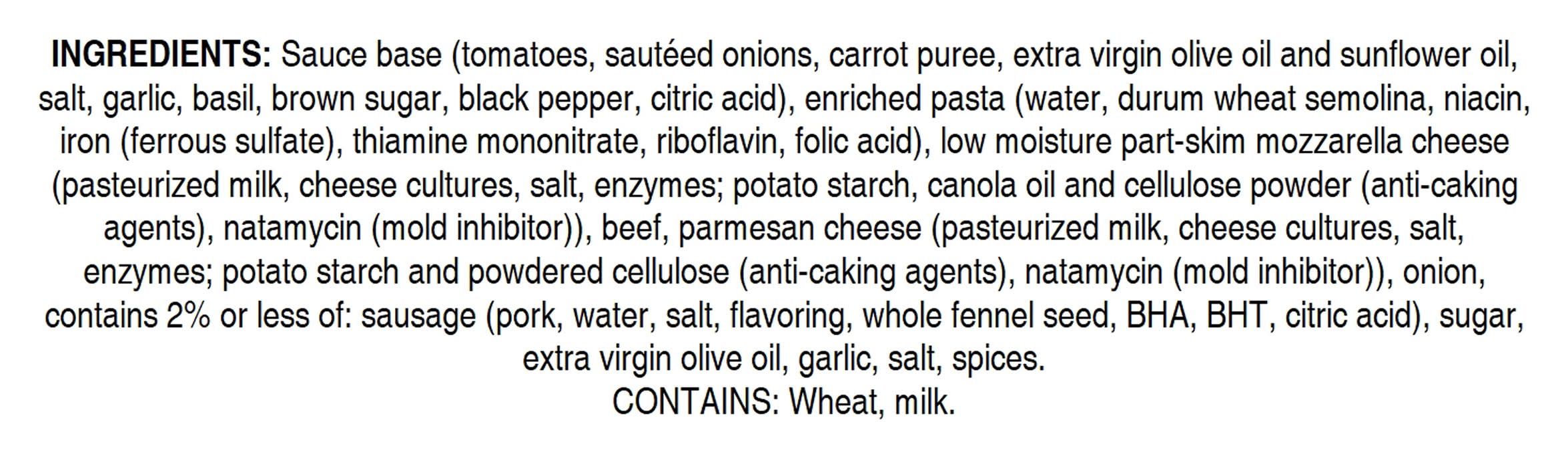 Ingredients: Sauce Base (Tomatoes, Sautéed Onions, Carrot Puree, Extra Virgin Olive Oil and Sunflower Oil, Salt, Garlic, Basil, Brown Sugar, Black Pepper, Citric Acid), Enriched Pasta (Water, Durum Wheat Semolina, Niacin, Iron (Ferrous Sulfate), Thiamine Mononitrate, Riboflavin, Folic Acid), Low Moisture Part-Skim Mozzarella Cheese (Pasteurized Milk, Cheese Cultures, Salt, Enzymes; Potato Starch, Canola Oil and Cellulose Powder (Anti-Caking Agents), Natamycin (Mold Inhibitor)), Beef, Parmesan Cheese (Pasteurized Milk, Cheese Cultures, Salt, Enzymes; Potato Starch and Powdered Cellulose (Anti-Caking Agents), Natamycin (Mold Inhibitor)), Onion, Contains 2% or Less of: Sausage (Pork, Water, Salt, Flavoring, Whole Fennel Seed, BHA, BHT, Citric Acid), Sugar, Extra Virgin Olive Oil, Garlic, Salt, Spices Contains: Wheat, Milk