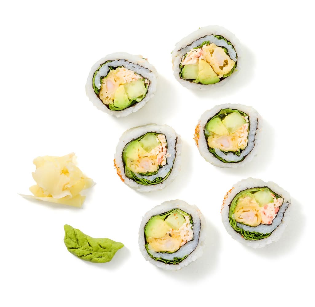 6 Pcs. Tempura Shrimp, Imitation Crab Salad, Avocado, Cucumber, Lettuce Size: 8 oz