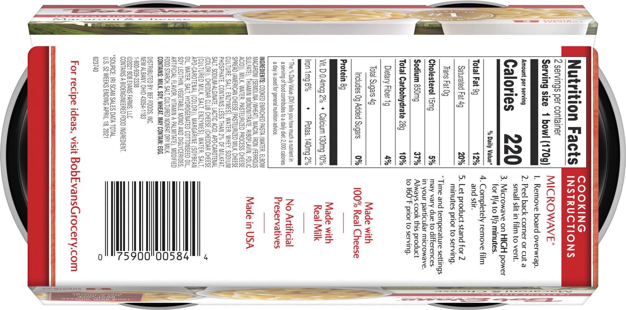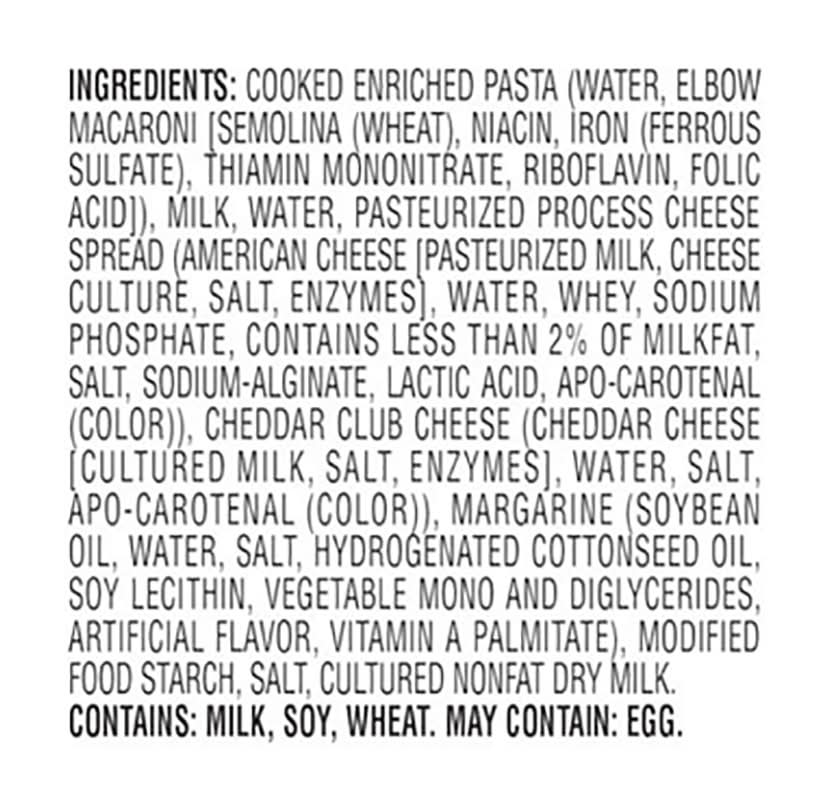 Ingredients: Cooked Enriched Pasta (Water, Elbow Macaroni [Semolina (Wheat), Niacin, Iron (Ferrous Sulfate), Thiamin Mononitrate, Riboflavin, Folic Acid]), Milk, Water, Pasteurized Process Cheese Spread (American Cheese [Pasteurized Milk, Cheese Culture, Salt, Enzymes], Water, Whey, Sodium Phosphate, Contains Less than 2% of Milkfat, Salt, Sodium-Alginate, Lactic Acid, Apo-Carotenal (Color)), Cheddar Club Cheese (Cheddar Cheese Cultured Milk, Salt, Enzymes], Water, Salt, Apo-Carotenal (Color)), Margarine (Soybean Oil, Water, Salt, Hydrogenated Cottonseed Oil, Soy Lecithin, Vegetable Mono and Diglycerides, Artificial Flavor, Vitamin A Palmitate), Modified Food Starch, Salt, Cultured Nonfat Dry Milk Contains: Milk, Soybeans, Wheat, Eggs