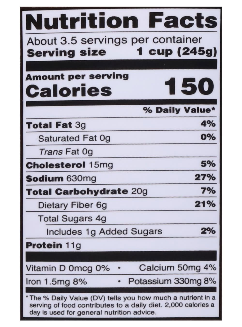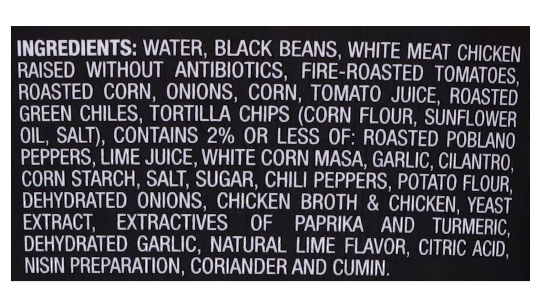 Ingredients: Water, Black Beans, White Meat Chicken Raised Without Antibiotics, Fire-Roasted Tomatoes, Roasted Corn, Onions, Corn, Tomato Juice, Roasted Green Chiles, Tortilla Chips (Corn Flour, Sunflower Oil, Salt), Contains 2% or Less of: Roasted Poblano Peppers, Lime Juice, White Corn Masa, Garlic, Cilantro, Corn Starch, Salt, Sugar, Chili Peppers, Potato Flour, Dehydrated Onions, Chicken Broth & Chicken, Yeast Extract, Extractives of Paprika and Turmeric, Dehydrated Garlic, Natural Lime Flavor, Citric Acid, Nisin Preparation, Coriander and Cumin Contains: Corn