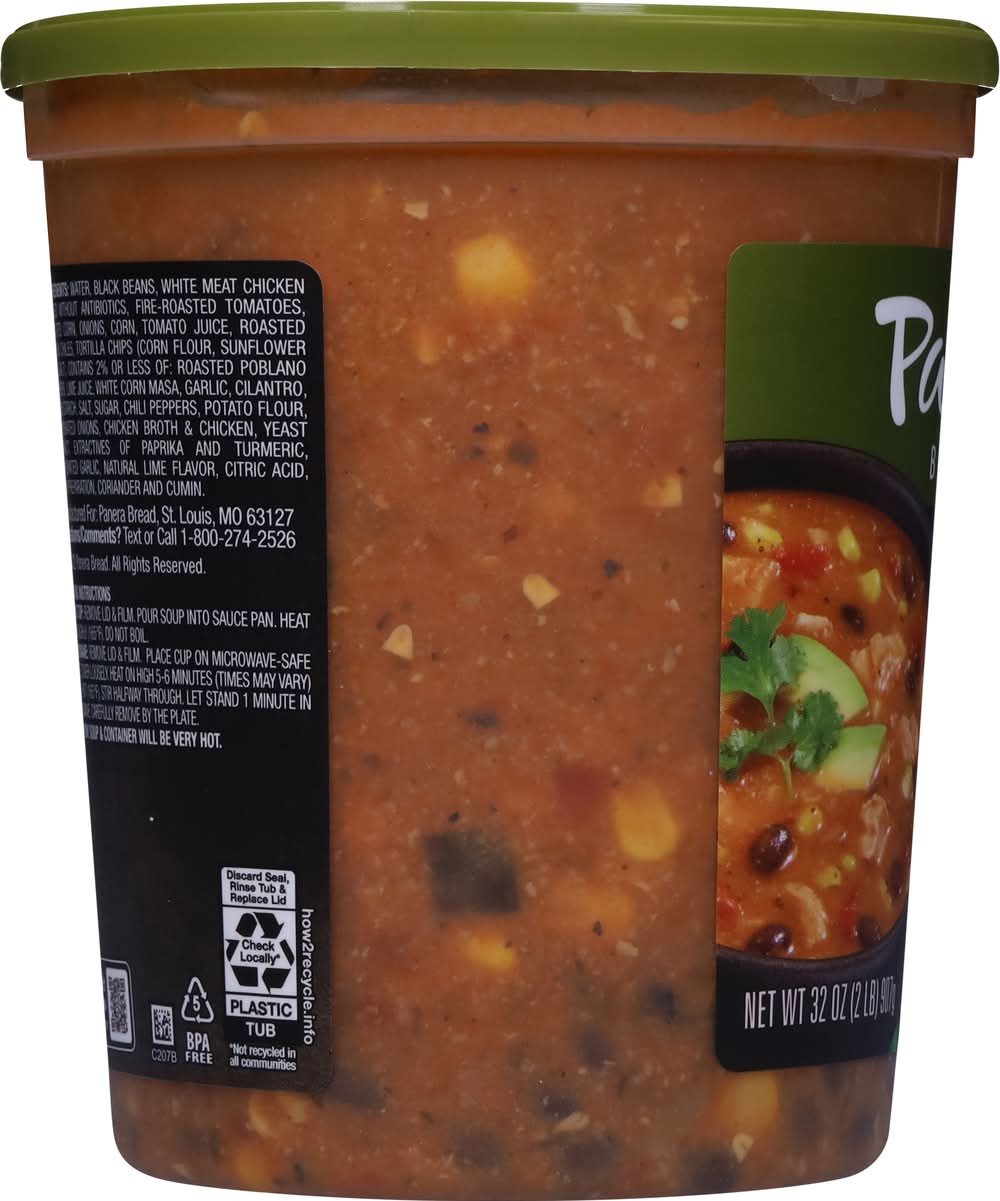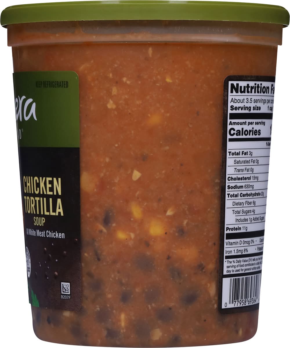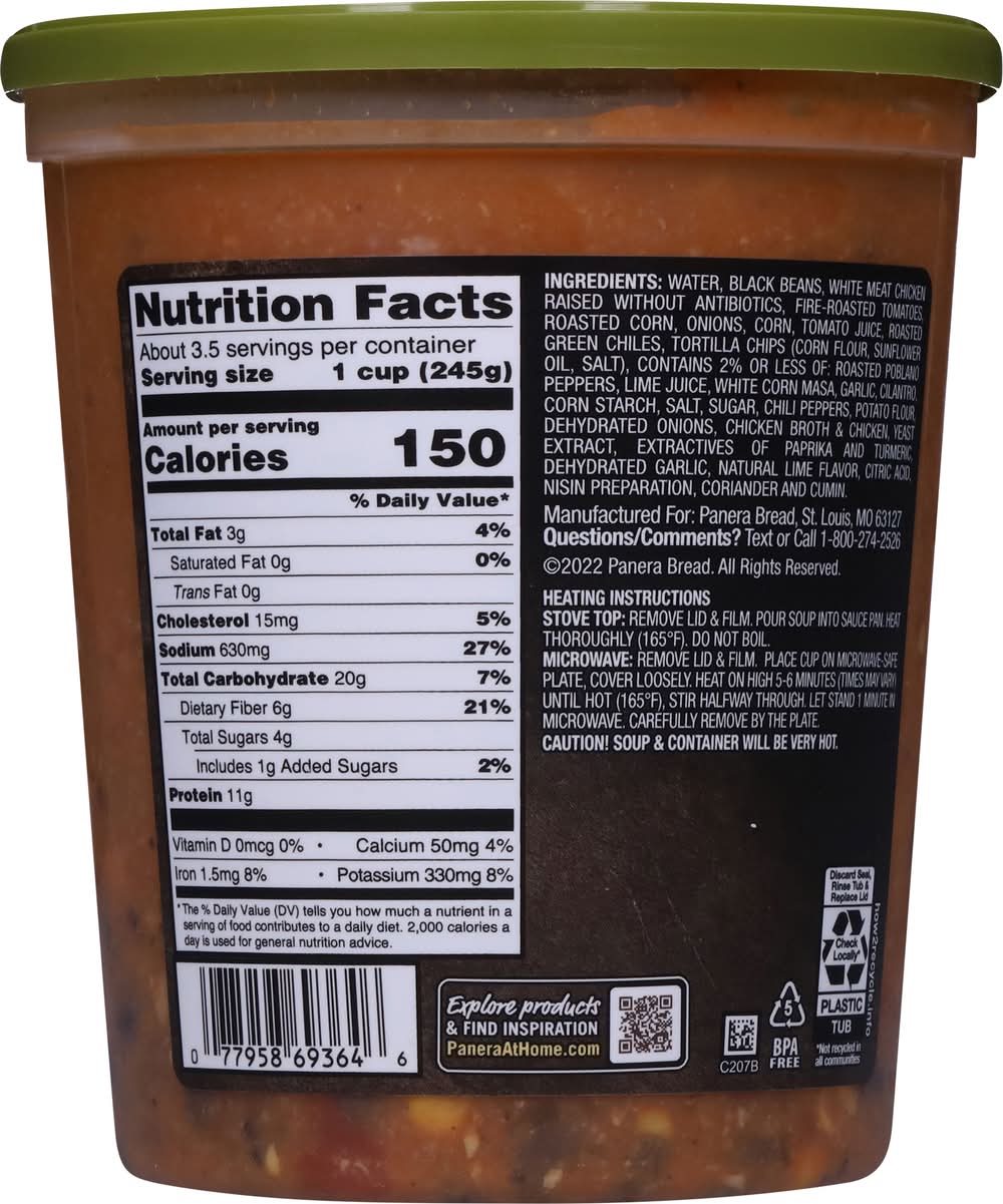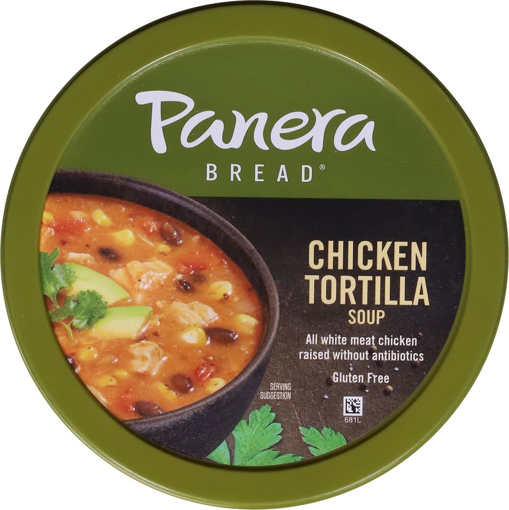 Panera Chicken Tortilla Soup delivers a bakery-cafe inspired favorite in a microwavable cup that you can take with you on-the-go. Seasoned with a hint of cumin and lime, this soup features roasted poblano peppers, corn, black beans and a kick of chile peppers. This gluten free soup is made with all white meat chicken raised without antibiotics. Whether you have a busy schedule and need a quick meal or you just want to enjoy a warm cup of soup, this Panera soup cup is perfect any time of day. Store this Panera soup in the refrigerator or freezer until you are ready to prepare. Make easy, craveable meals with help from Panera Bread at home.One 32 oz cup of Panera Chicken Tortilla SoupStore Panera soup in the refrigerator or freezer until you are ready to prepareGluten free chunky soup that is made with roasted poblano peppers, corn, black beans and a kick of chile peppersMicrowave soup cup is made with all white meat from chicken raised without antibiotics and is dairy freeHeat this Panera soup in the microwave on high for five to six minutes, or cook on the stove top to 165 degrees FBakery-cafe inspired Panera Chicken Tortilla Soup cup that’s easy to enjoy at your convenience • Size: 32 oz • Number of servings: 3 • Panera Bread, St. Louis, MO, 63127, Ph: 800-274-2526 • Packaging: Reusable