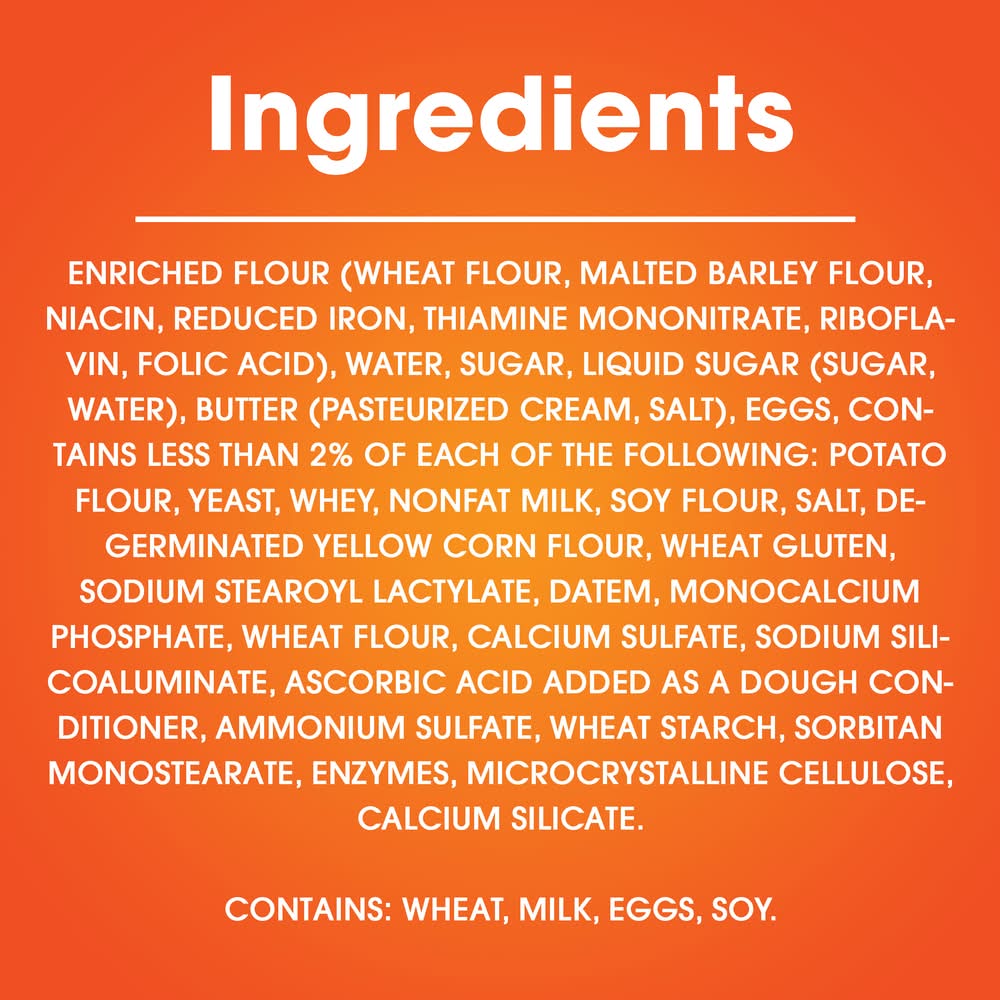 Ingredients: Enriched Flour Wheat Flour, Malted Barley Flour, Niacin, Reduced Iron, Thiamine Mononitrate, Riboflavin, Folic Acid, Water, Sugar, Butter Pasteurized Cream, Salt, Eggs, Contains Less than 2% of Each of the Following: Sodium Silicoaluminate, Potato Flour, Yeast, Sorbitan Monostearate, Ascorbic Acid Added as a Dough Conditioner, Whey, Corn Flour, Monocalcium Phosphate, Soy Flour, Nonfat Milk, Salt, Wheat Gluten, DATEM, Calcium Silicate Anti-Caking, Sodium Stearoyl Lactylate, Calcium Sulfate, Ammonium Sulfate, Wheat Starch, Enzymes. Contains: Eggs, Milk, Soybeans, Wheat, Barley, Corn, Gluten