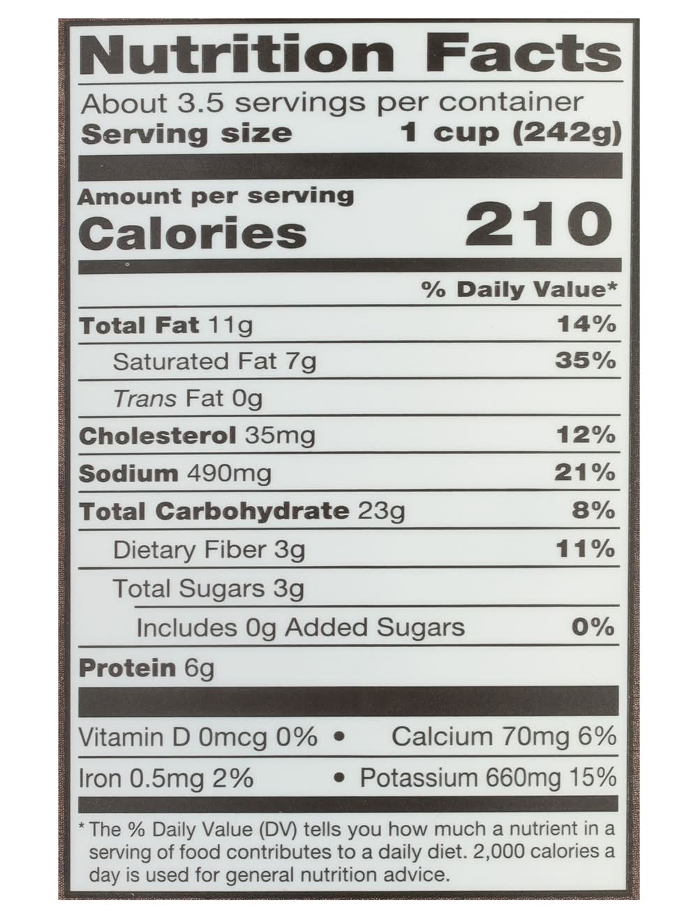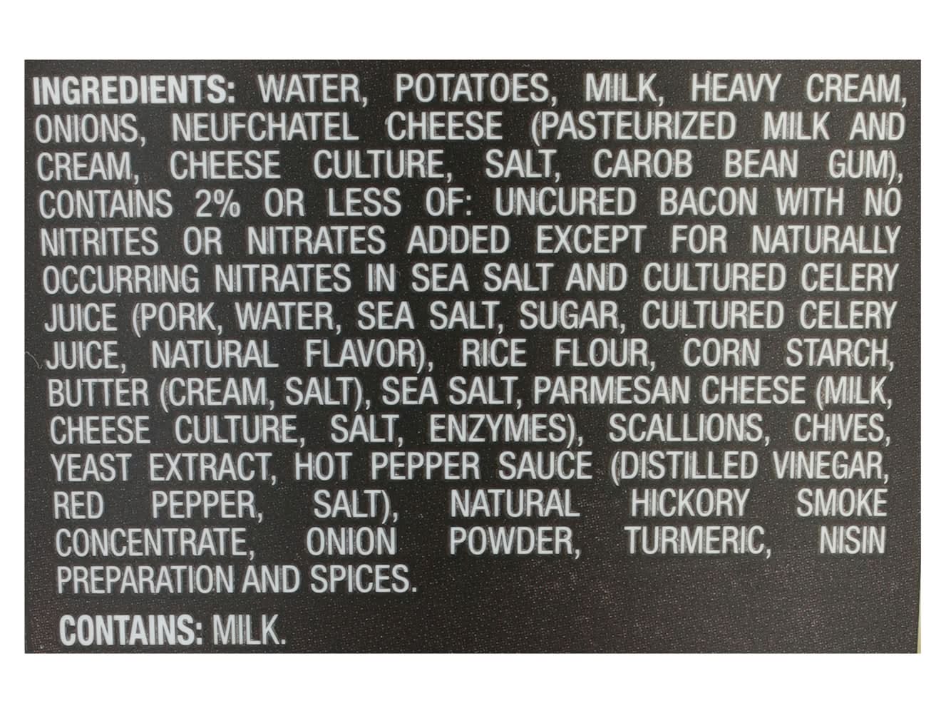 Ingredients: Water, Potatoes, Milk, Heavy Cream, Onions, Neufchatel Cheese (Pasteurized Milk and Cream, Cheese Culture, Salt, Carob Bean Gum), Contains 2% or Less of: Uncured Bacon with No Nitrites or Nitrates Added Except for Naturally Occurring Nitrates in Sea Salt and Cultured Celery Juice (Pork, Water, Sea Salt, Sugar, Cultured Celery Juice, Natural Flavor), Rice Flour, Corn Starch, Butter (Cream, Salt), Sea Salt, Parmesan Cheese (Milk, Cheese Culture, Salt, Enzymes), Scallions, Chives, Yeast Extract, Hot Pepper Sauce (Distilled Vinegar, Red Pepper, Salt), Natural Hickory Smoke Concentrate, Onion Powder, Turmeric, Nisin Preparation and Spices Contains: Milk, Celery, Corn, Tree Nuts, Hickory Nuts