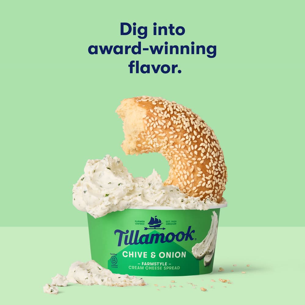 For real taste worth spreading, grab Tillamook Farmstyle Chive and Onion Cream Cheese Spread. This rich, creamy and herby spread will make every snack, bagel and recipe extraordinary. Smooth and creamy, this spreadable cream cheese spread has real cheese flavor that makes every bite more delicious. Use this versatile cream cheese spread on bagels or to add delicious flavor to your favorite foods and recipes. Tillamook Farmstyle Chive and Onion Cream Cheese Spread is a rich product that has a real, unmatched flavor because it’s made better.One 7 oz container of Tillamook Chive and Onion Cream Cheese SpreadA rich, tangy herby cream cheese that adds delicious chive and onion flavor to your favorite foods and recipesVersatile cream cheese spread that can be used as a bagel spread or when baking your favorite dishesThis soft cream cheese is kosher, pasteurized and made from high-quality cream for best qualityStore cream cheese tub in refrigerator when not using to keep freshAs a Certified B Corp, Tillamook is committed to being good stewards of cows and farms, of people and products, their communities and the environmentDo Right By Every Bite with this rich, tangy Tillamook Cream Cheese Spread • Size: 7 oz • Tillamook County Creamery Association, Tillamook, OR, 97141