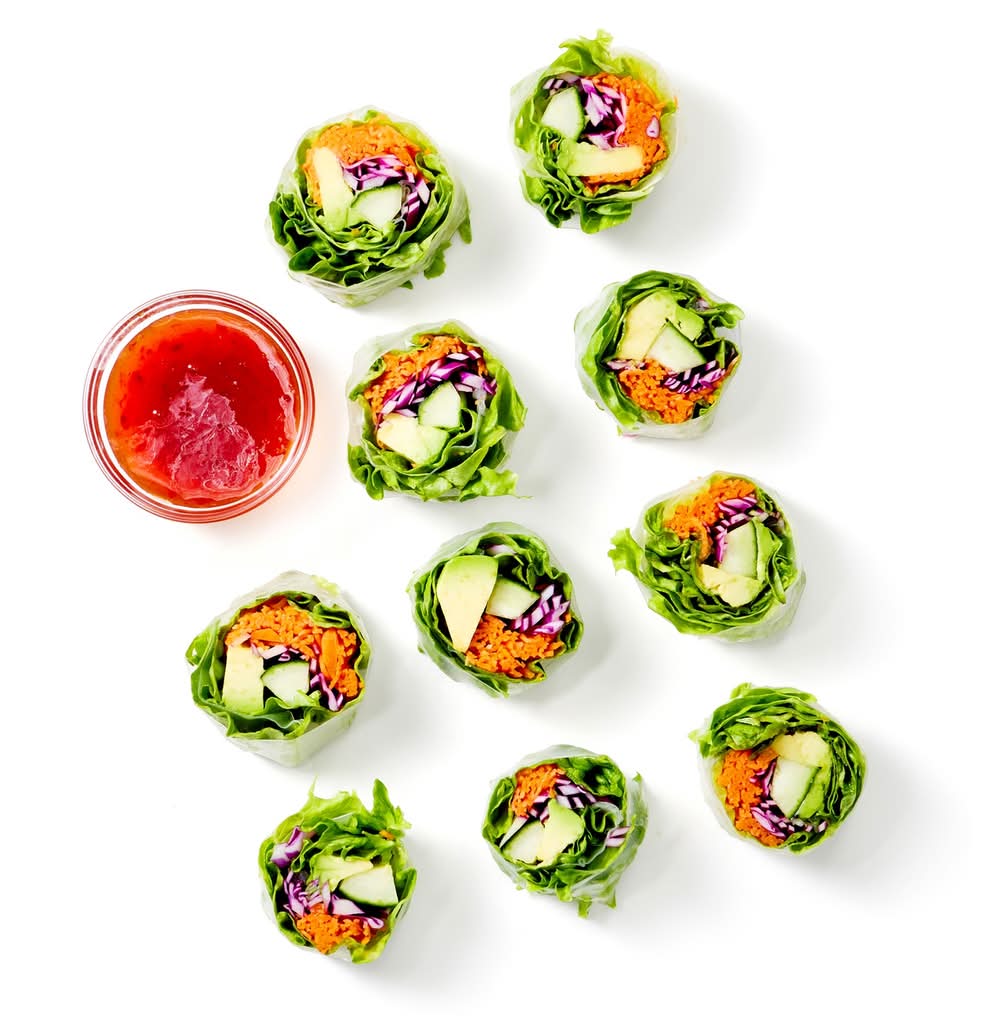 8 pieces. Lettuce, pickled carrot, avocado, cucumber, red cabbage, rice paper and sweet chili sauce packet. Size: 8 pc / 6 oz
