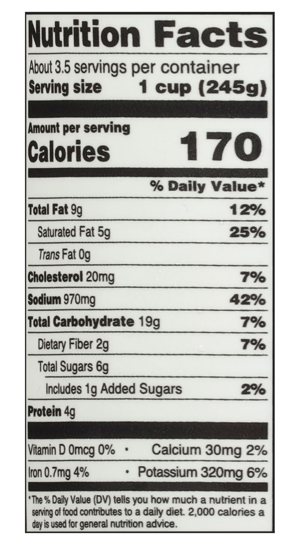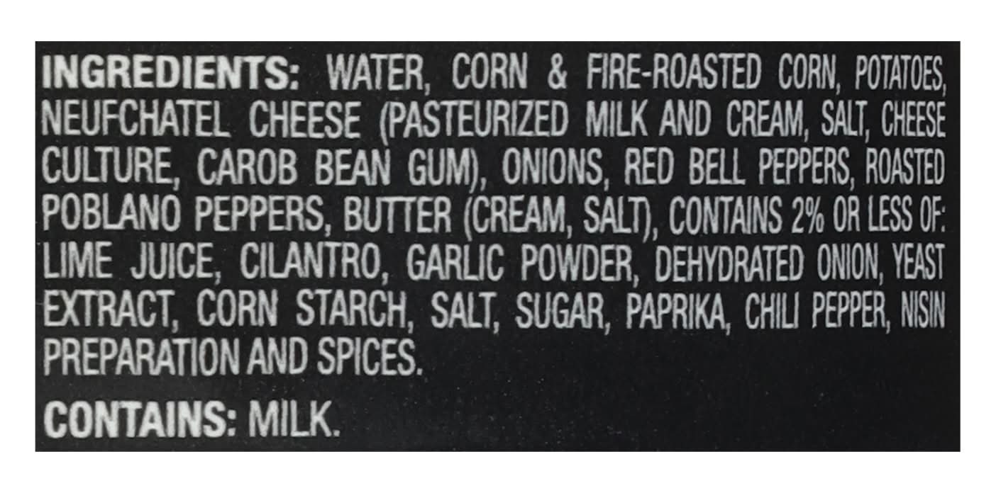 Ingredients: Water, Corn & Fire-Roasted Corn, Potatoes Neufchatel Cheese (Pasteurized Milk and Cream, Salt, Cheese Culture, Carob Bean Gum), Onions, Red Bell Peppers, Roasted Poblano Peppers, Butter (Cream, Salt), Contains 2% or Less of Lime Juice, Cilantro, Garlic Powder, Dehydrated Onion, Yeast Extract, Corn Starch, Salt, Sugar, Paprika, Chili Pepper, Nisin Preparation and Spices Contains: Milk, Corn