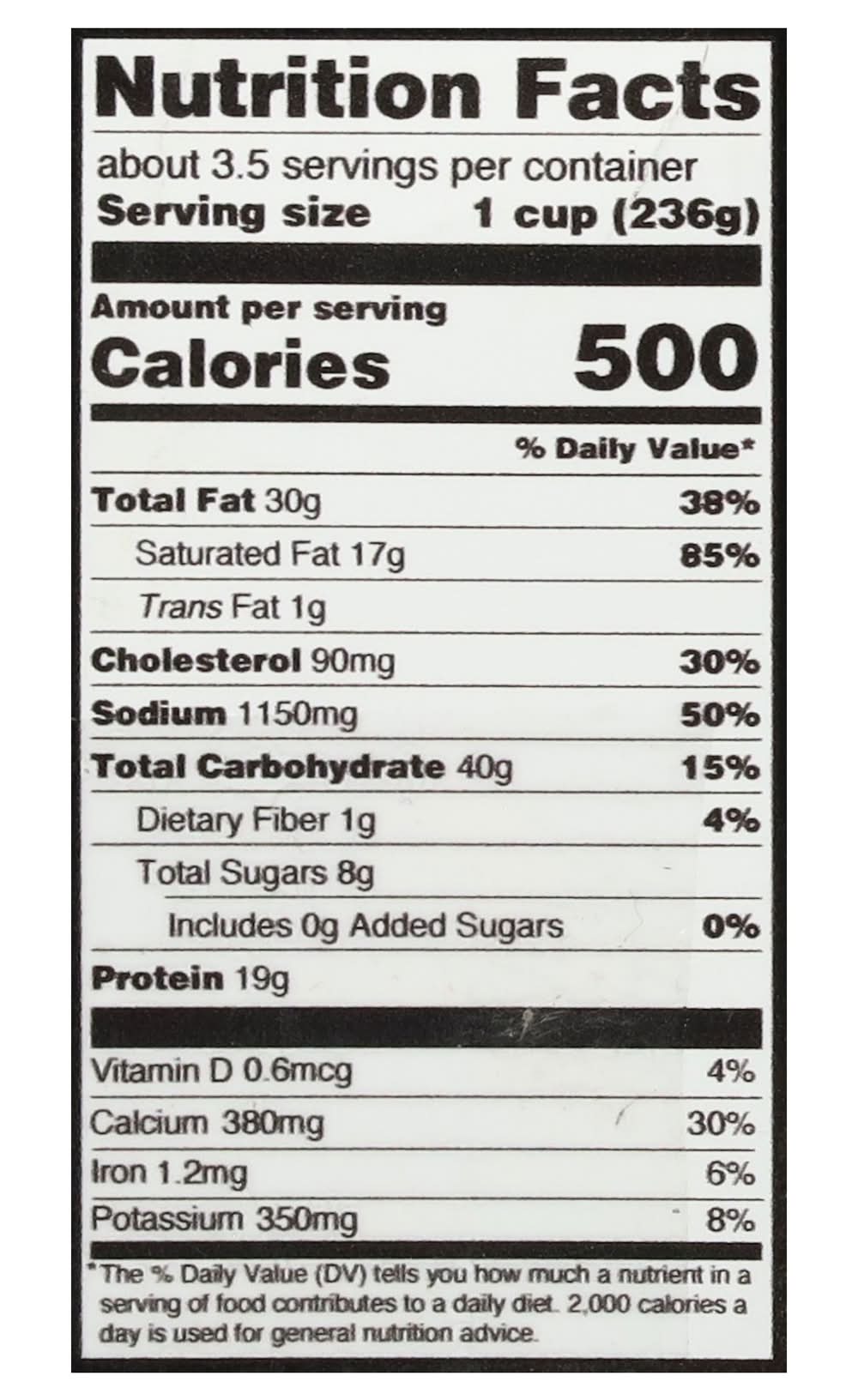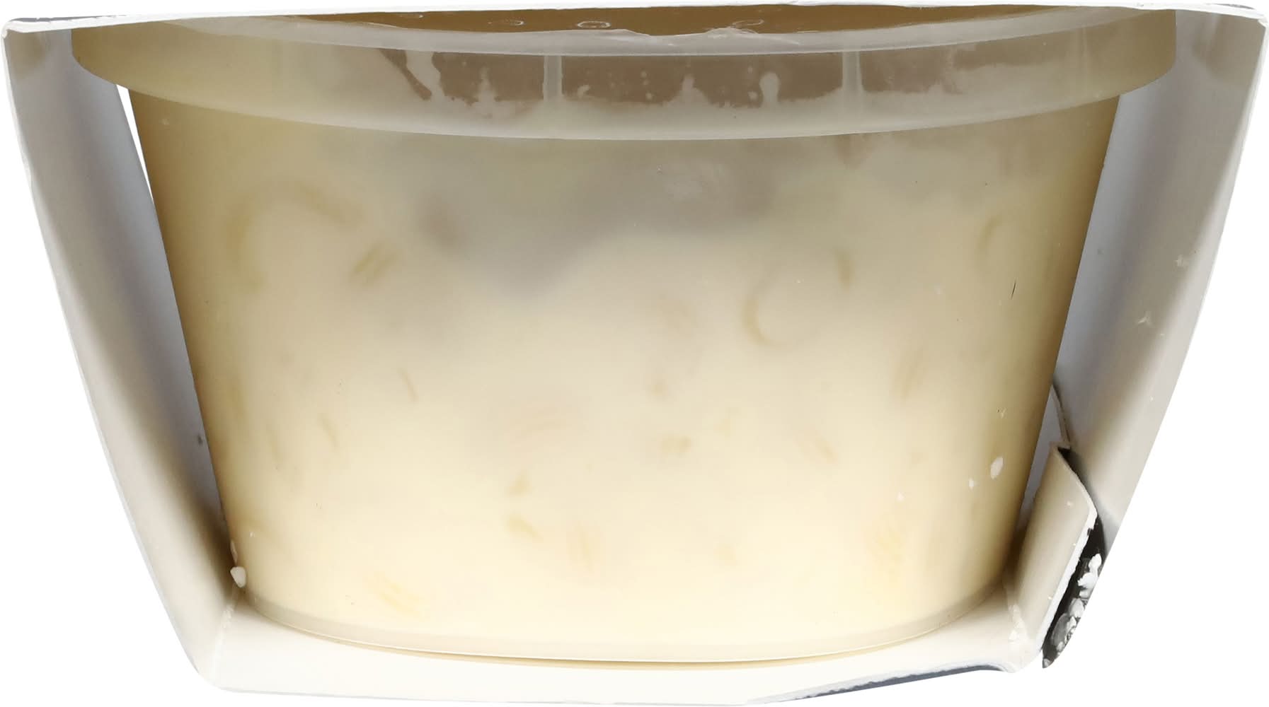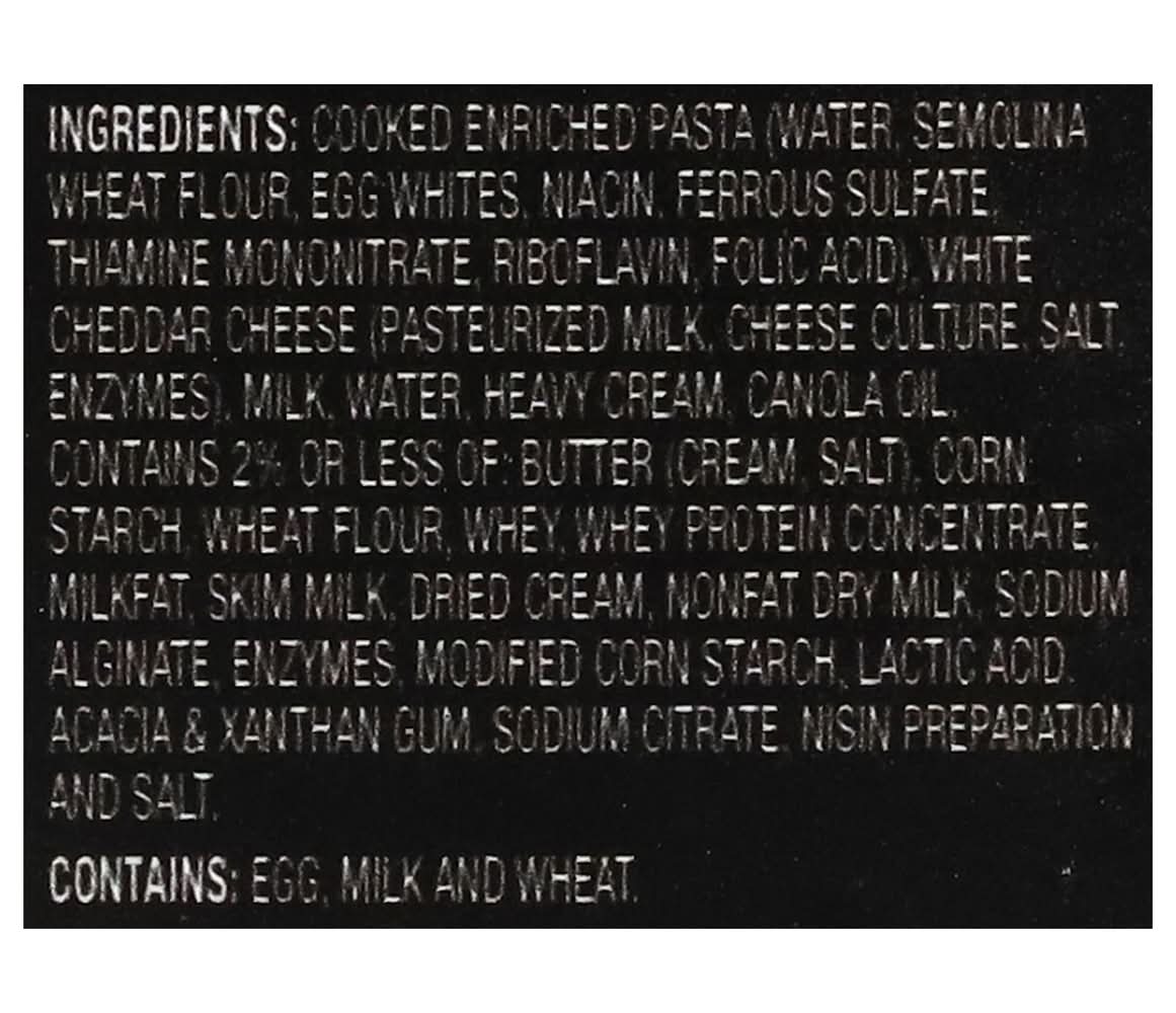 Ingredients: Cooked Enriched Pasta (Water, Semolina Wheat Flour, Egg Whites, Niacin, Ferrous Sulfate, Thiamine Mononitrate, Riboflavin, Folic Acid), White Cheddar Cheese (Pasteurized Milk, Cheese Culture, Salt, Enzymes), Milk, Water, Heavy Cream, Canola Oil, Contains 2% or Less of: Butter (Cream, Salt), Corn Starch, Wheat Flour, Whey, Whey Protein Concentrate, Milkfat, Skim Milk, Dried Cream, Nonfat Dry Milk, Sodium Alginate, Enzymes, Modified Corn Starch, Lactic Acid, Acacia & Xanthan Gum, Sodium Citrate, Nisin Preparation and Salt Contains: Eggs, Milk, Wheat