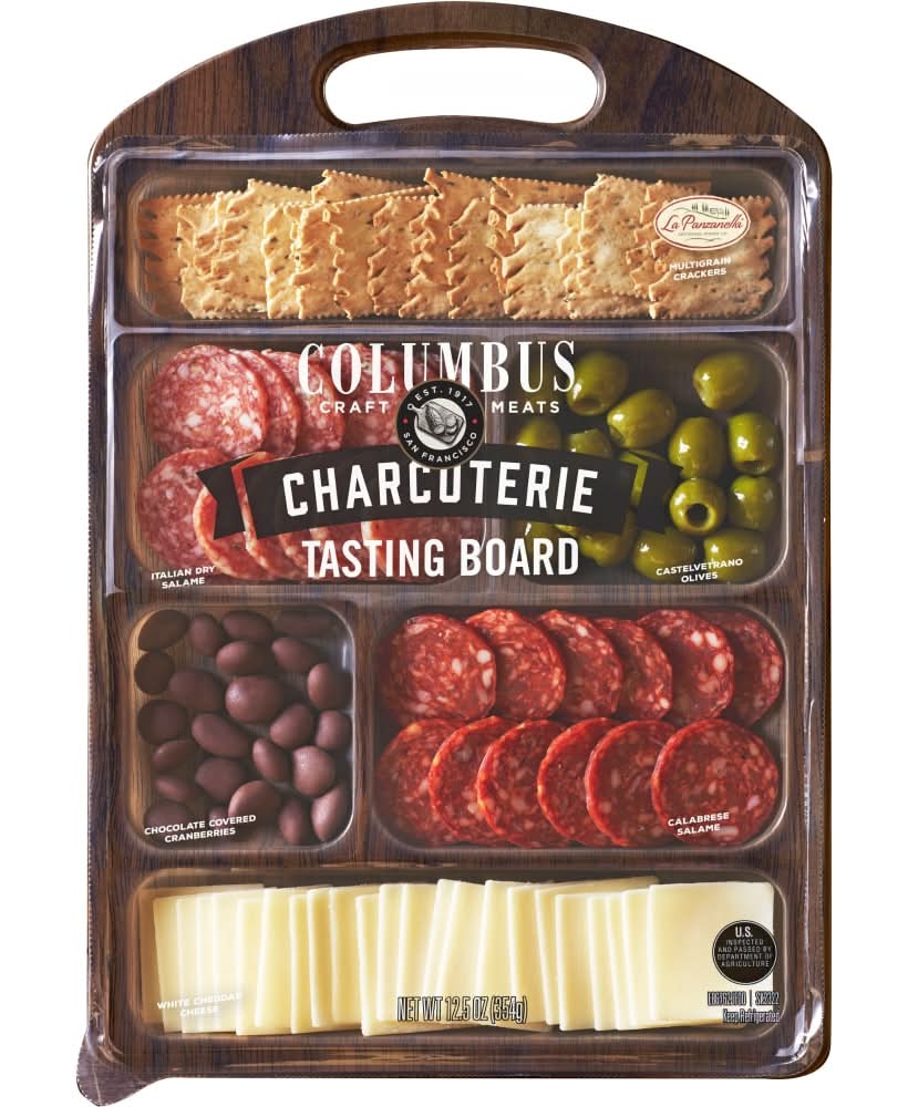 Simply peel and enjoy the Columbus® Charcuterie Tasting Board while entertaining friends or during family gatherings. This 12.5 oz pack includes Columbus® Italian Dry Salami, Columbus® Calabrese Salami, White Cheddar Cheese, La Panzanella Multigrain Crackers, Castelvetrano Olives, and Dark Chocolate Covered Cranberries. The ready-to-go charcuterie board comes in a "wood grain" tray for beautiful presentation. The premium ingredients were specially selected and perfectly paired for an amazing charcuterie experience. This portable charcuterie board is the perfect appetizer for any party, gathering or picnic. It pairs well with a glass of pinot noir, sauvignon blanc, pale ale or amber lager. Columbus® is a trademark of Columbus Manufacturing, Inc. ©2022 Columbus Manufacturing, Inc. All images are owned by Columbus Manufacturing, Inc.Convenient, ready to serve charcuterie board; Just peel and enjoyContains slow-aged Italian Dry and Calabrese salami, white cheddar cheese, La Panzanella multigrain crackers, Castelvetrano olives, and dark chocolate covered cranberriesSpecially selected and perfectly paired items for a premium charcuterie experienceImpress your guests with this convenient charcuterie board, perfect for entertaining, picnics, or any other occasionIncludes one, 12.5 oz pack of COLUMBUS Charcuterie Tasting Board; Packaged for freshness and convenience • Size: 12.5 oz • Columbus Salumeria, Hayward, CA, 94544