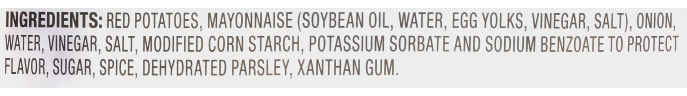 Ingredients: Red Potatoes, Mayonnaise (Soybean Oil, Water, Egg Yolks, Vinegar, Salt), Onion, Water, Vinegar, Salt, Modified Corn Starch, Potassium Sorbate and Sodium Benzoate to Protect Flavor, Sugar, Spice, Dehydrated Parsley, Xanthan Gum Contains: Soybeans, Eggs