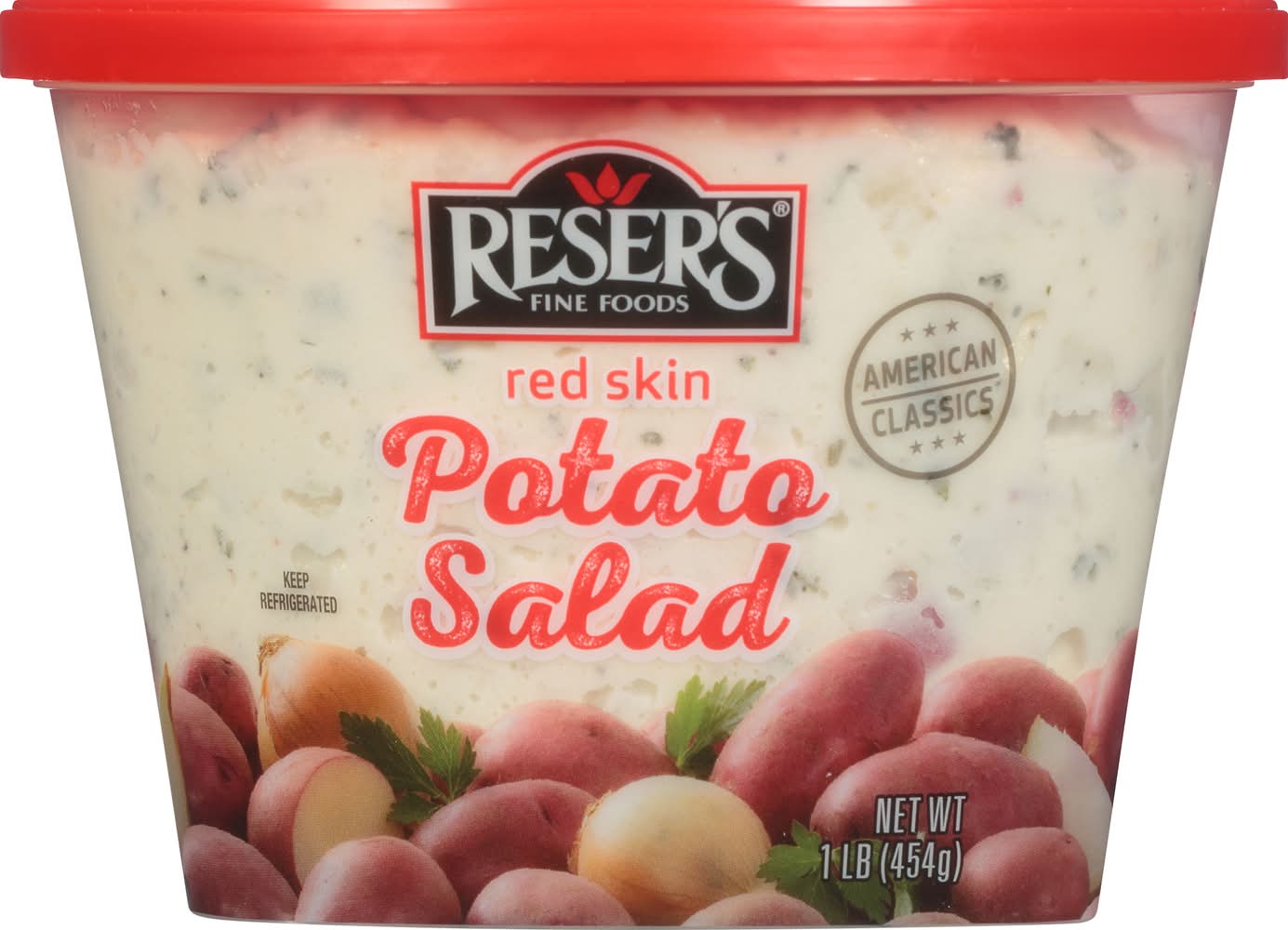 Red Skin Potato Salad adds a pop of color to your plate with earthy unpeeled red potatoes, crunchy celery and chopped white onion in a light and supple mayonnaise dressing. Offered in a convenient, reusable container with NO high fructose corn syrup or artificial colors or flavors. Reser's Fine Foods believes in using high quality ingredients and time tested recipes to bring you deli salads and sides. Size: 1 lb