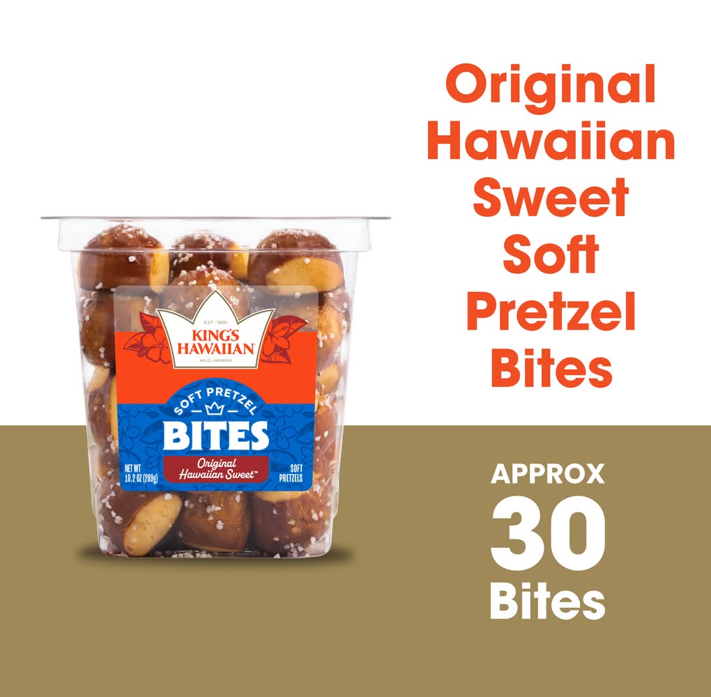 KING’S HAWAIIAN® Original Hawaiian Sweet Soft Pretzel Bites are a mix of sweet and salty to add to your snacking rotation. Whether eating alone or dipping, these bites pack a delicious punch!Pre-salted.No high fructose corn syrupSweet & Salty Pretzel Bites. A Flavor Journey in Every Bite. Size: 10.2 oz
