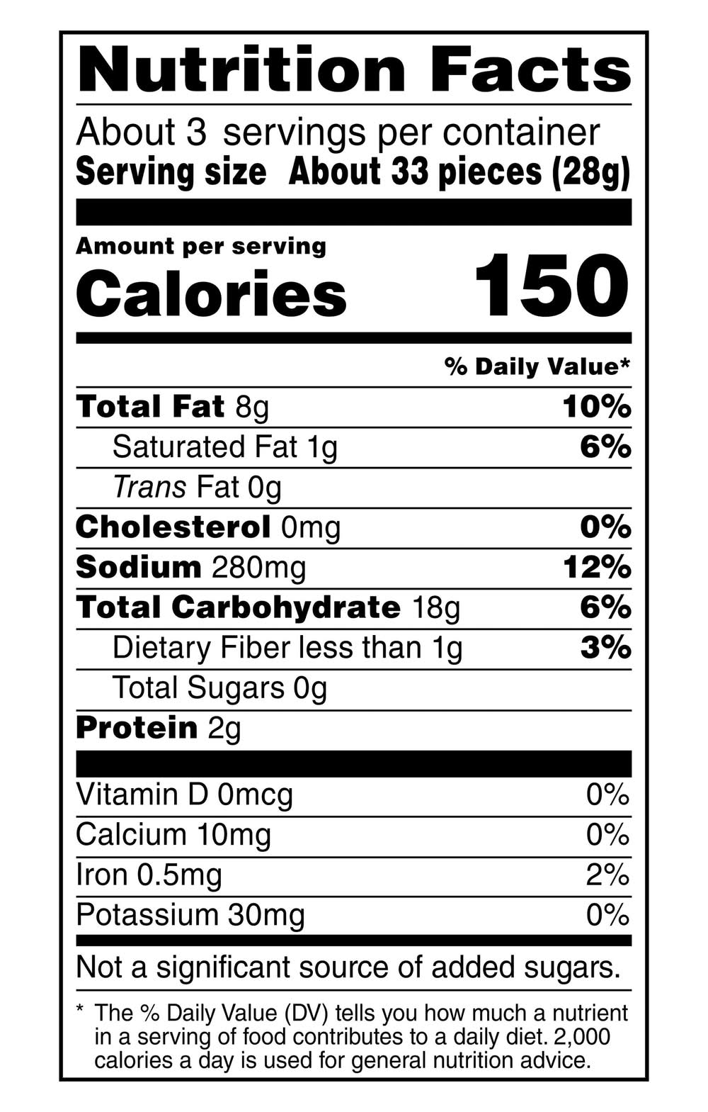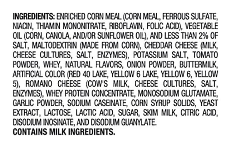 Ingredients: Enriched Corn Meal (Corn Meal, Ferrous Sulfate, Niacin, Thiamin Mononitrate, Riboflavin, Folic Acid), Vegetable Oil (Corn, Canola, and/or Sunflower Oil), and Less than 2% of Salt, Maltodextrin (Made from Corn), Cheddar Cheese (Milk, Cheese Cultures, Salt, Enzymes), Potassium Salt, Tomato Powder, Whey, Natural Flavors, Onion Powder, Buttermilk, Artificial Color (Red 40 Lake, Yellow 6 Lake, Yellow 6, Yellow 5), Romano Cheese (Cow's Milk, Cheese Cultures, Salt, Enzymes), Whey Protein Concentrate, Monosodium Glutamate, Garlic Powder, Sodium Caseinate, Corn Syrup Solids, Yeast Extract, Lactose, Lactic Acid, Sugar, Skim Milk, Citric Acid, Disodium Inosinate, and Disodium Guanylate Contains: Milk, Lactose