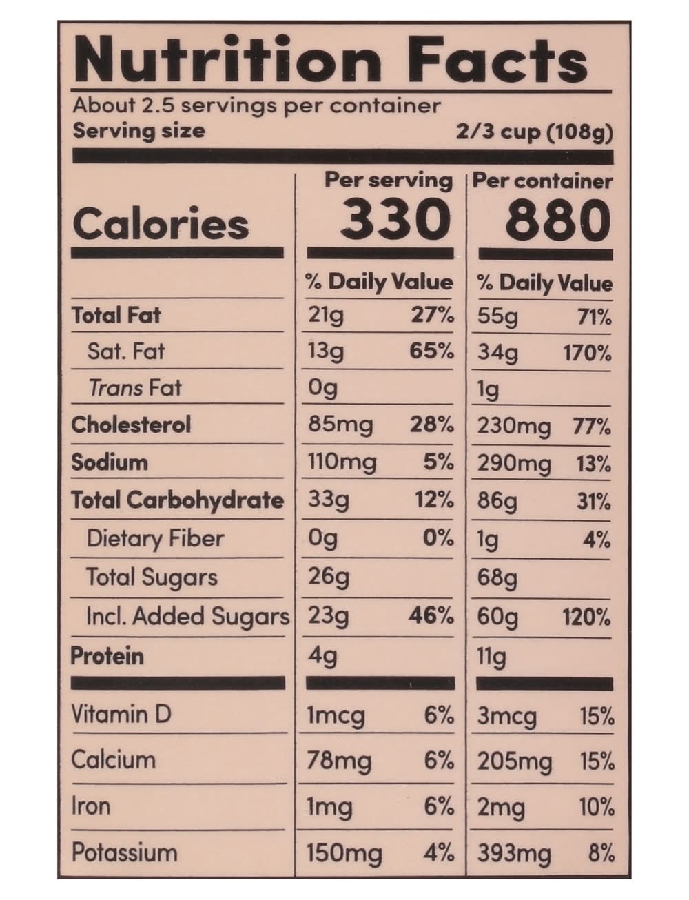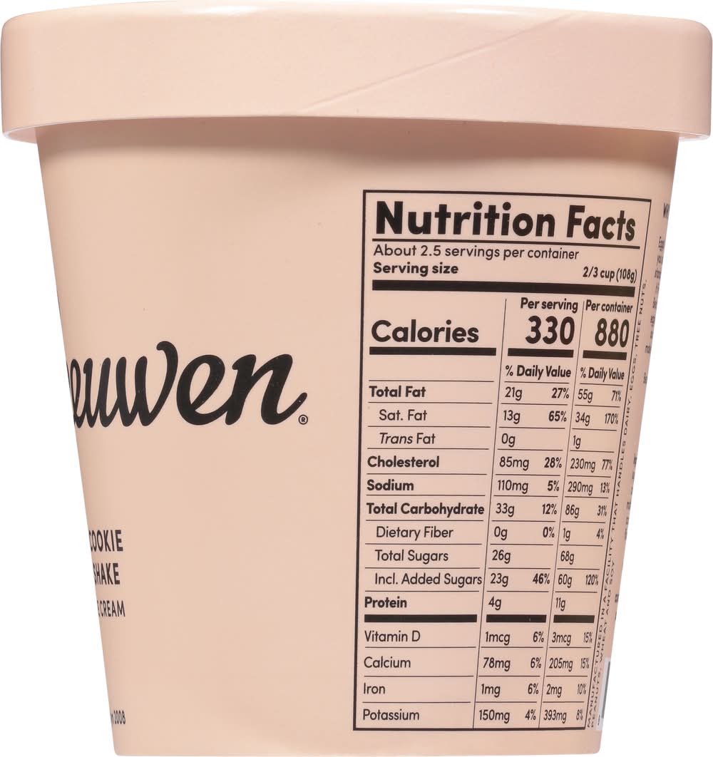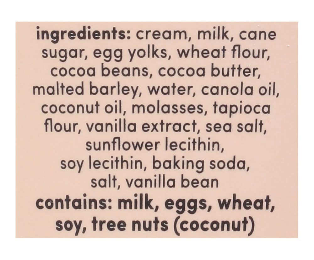 Ingredients: Cream, Milk, Cane Sugar, Egg Yolks, Wheat Flour, Cocoa Beans, Cocoa Butter, Malted Barley, Water, Canola Oil, Coconut Oil, Molasses, Tapioca Flour, Vanilla Extract, Sea Salt, Sunflower Lecithin, Soy Lecithin, Baking Soda, Salt, Vanilla Bean Contains: Milk, Eggs, Wheat, Soybeans, Tree Nuts, Coconuts, Eggs, Peanuts, Wheat, Soybeans, Milk, Tree Nuts