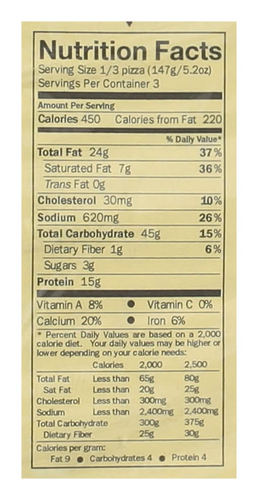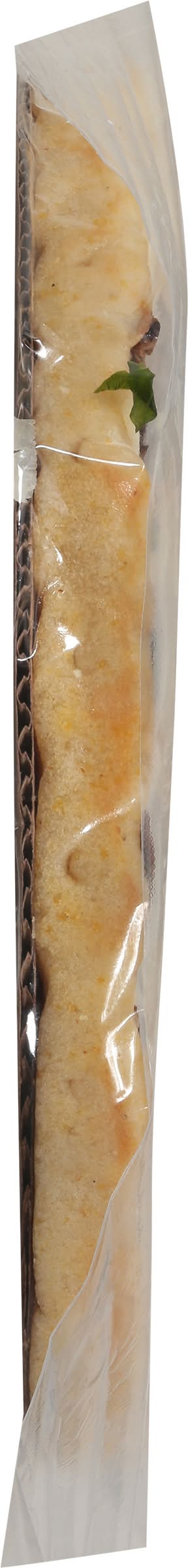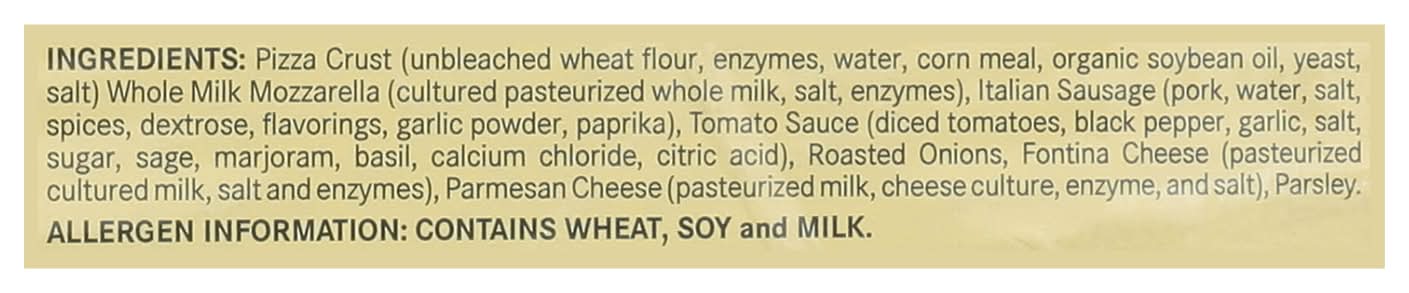 Ingredients: Pizza Crust (Unbleached Wheat Flour, Enzymes, Water, Corn Meal, Organic Soybean Oil, Yeast, Salt) Whole Milk Mozzarella (Cultured Pasteurized Whole Milk, Salt, Enzymes), Italian Sausage (Pork, Water, Salt, Spices, Dextrose, Flavorings, Garlic Powder, Paprika), Tomato Sauce (Diced Tomatoes, Black Pepper, Garlic, Salt, Sugar, Sage, Marjoram, Basil, Calcium Chloride, Citric Acid), Roasted Onions, Fontina Cheese (Pasteurized Cultured Milk, Salt and Enzymes), Parmesan Cheese (Pasteurized Milk, Cheese Culture, Enzyme, and Salt), Parsley Contains: Wheat, Soybeans, Milk