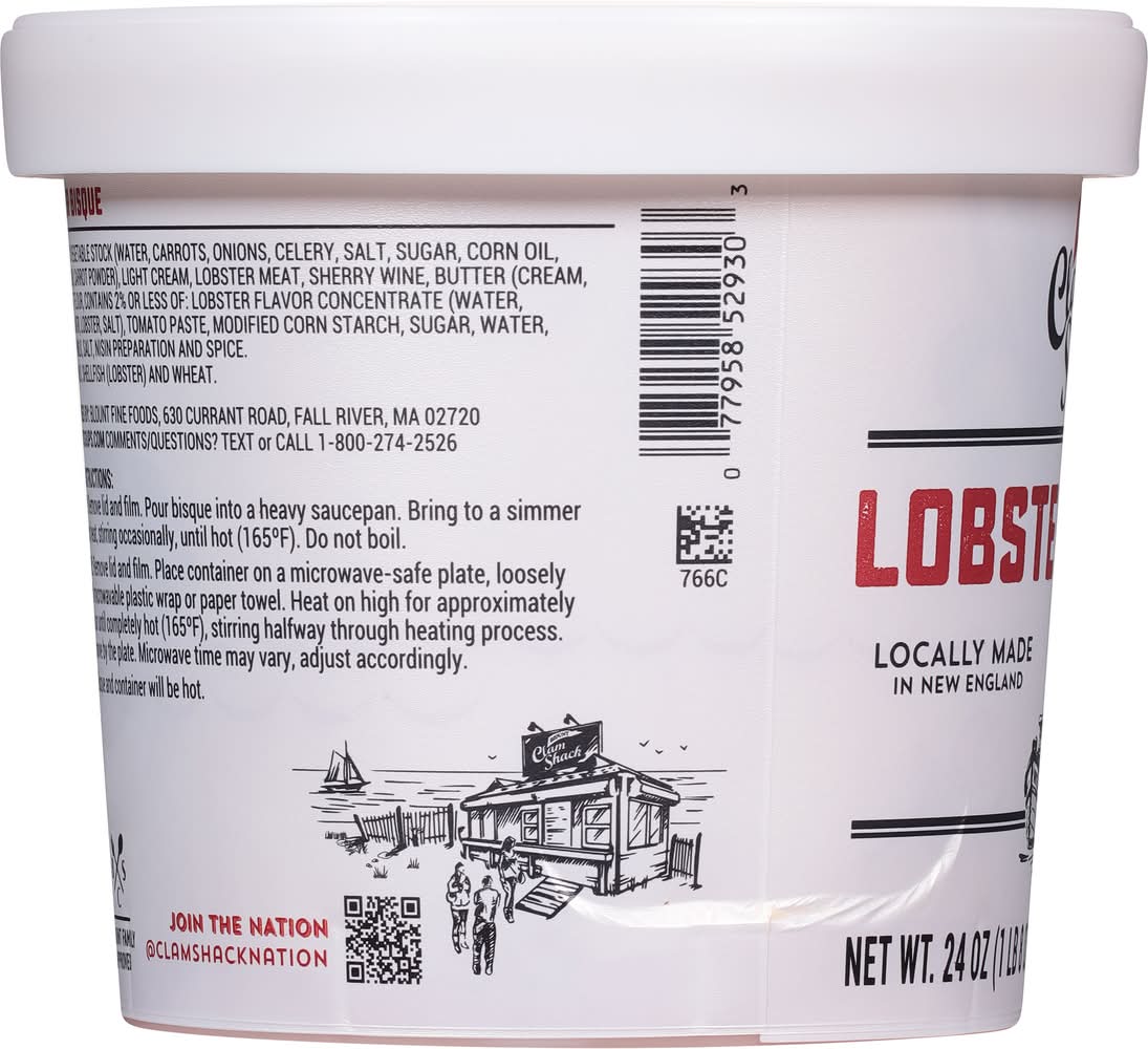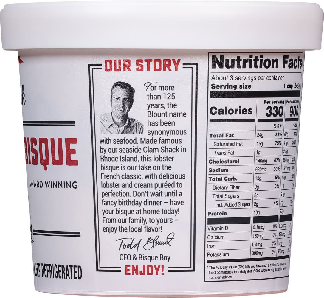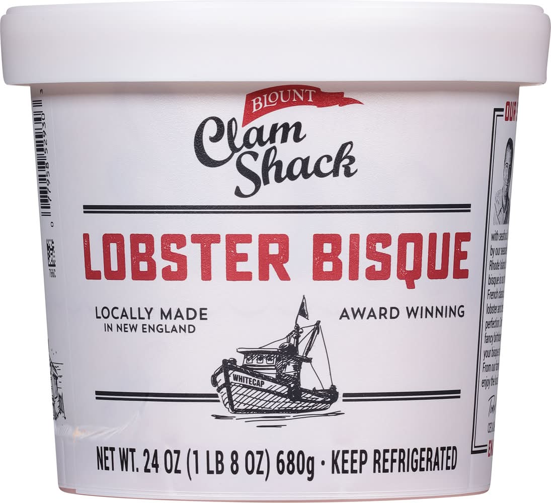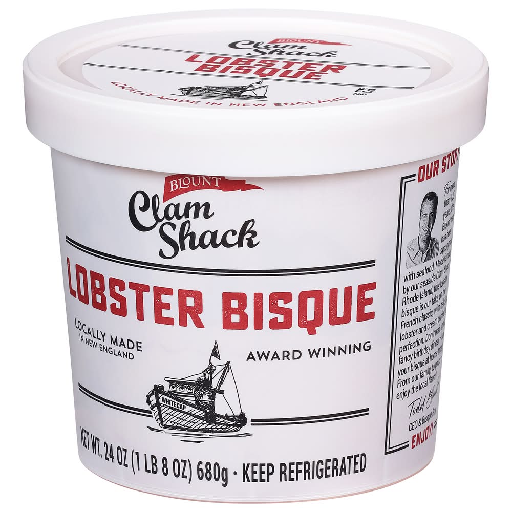 Award winning. Kettle cooked. Blount family approved. Our Story: For more than 125 years, the Blount name has been 16 synonymous with seafood. Made famous by our seaside Clam Shack in Rhode Island, this lobster bisque is our take on the French classic, with delicious lobster and cream pureed to perfection. Don't wait until a fancy birthday dinner - have your bisque at home today.