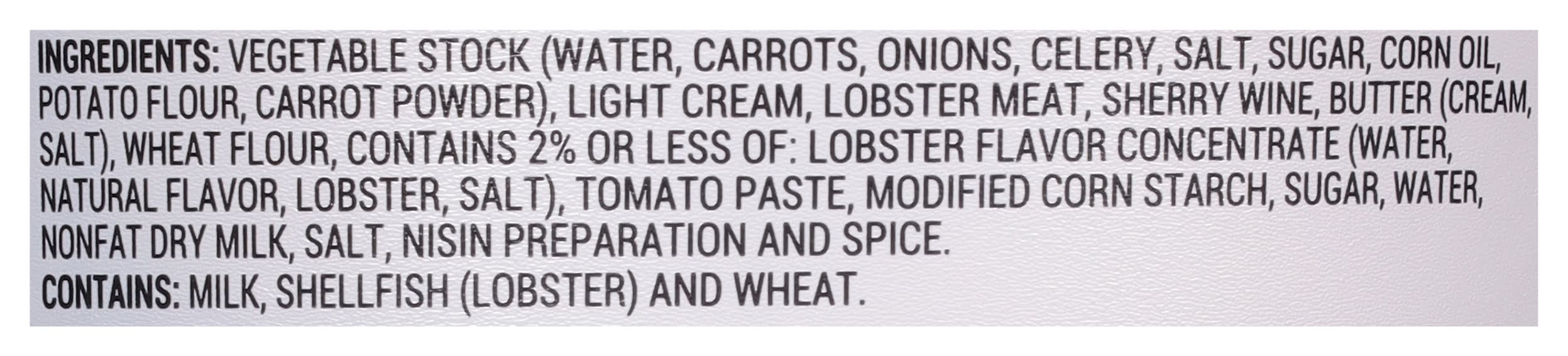 Ingredients: Vegetable Stock (Water, Carrots, Onions, Celery, Salt, Sugar, Corn Oil, Potato Flour, Carrot Powder), Light Cream, Lobster Meat, Sherry Wine, Butter (Cream, Salt), Wheat Flour, Contains 2% or Less of: Lobster Flavor Concentrate (Water, Natural Flavor, Lobster, Salt), Tomato Paste, Modified Corn Starch, Sugar, Water, Nonfat Dry Milk, Salt, Nisin Preparation and Spice Contains: Milk, Crustacean Shellfish, Lobster, Wheat, Celery, Corn