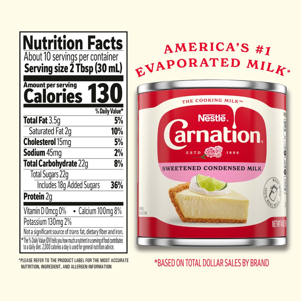 Discover the rich and creamy taste of nestlé carnation sweetened condensed milk, your go-to sweetened condensed milk for culinary delights. crafted with high quality ingredients, carnation milk has a creamy texture that enhances sweet recipes. carnation sweetened condensed milk is ideal for creating indulgent dishes such as key lime pie, fudge and lattes. simply store in a cool dry place, refrigerate after opening, and consume within a few days. Packaging: Reusable