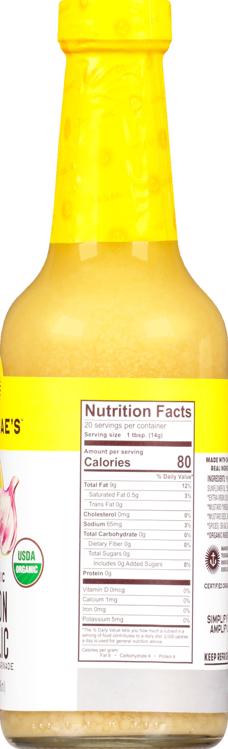 Ingredients: High Oleic Sunflower Oil (Organic Ingredients), Lemon Juice (Organic Ingredients), Extra Virgin Olive Oil (Organic Ingredients), Mustard (Organic Ingredients) (Vinger (Organic Ingredients), Water, Mustard Seed (Organic Ingredients), Salt, Spices (Organic Ingredients)), Sea Salt, Garlic Oil