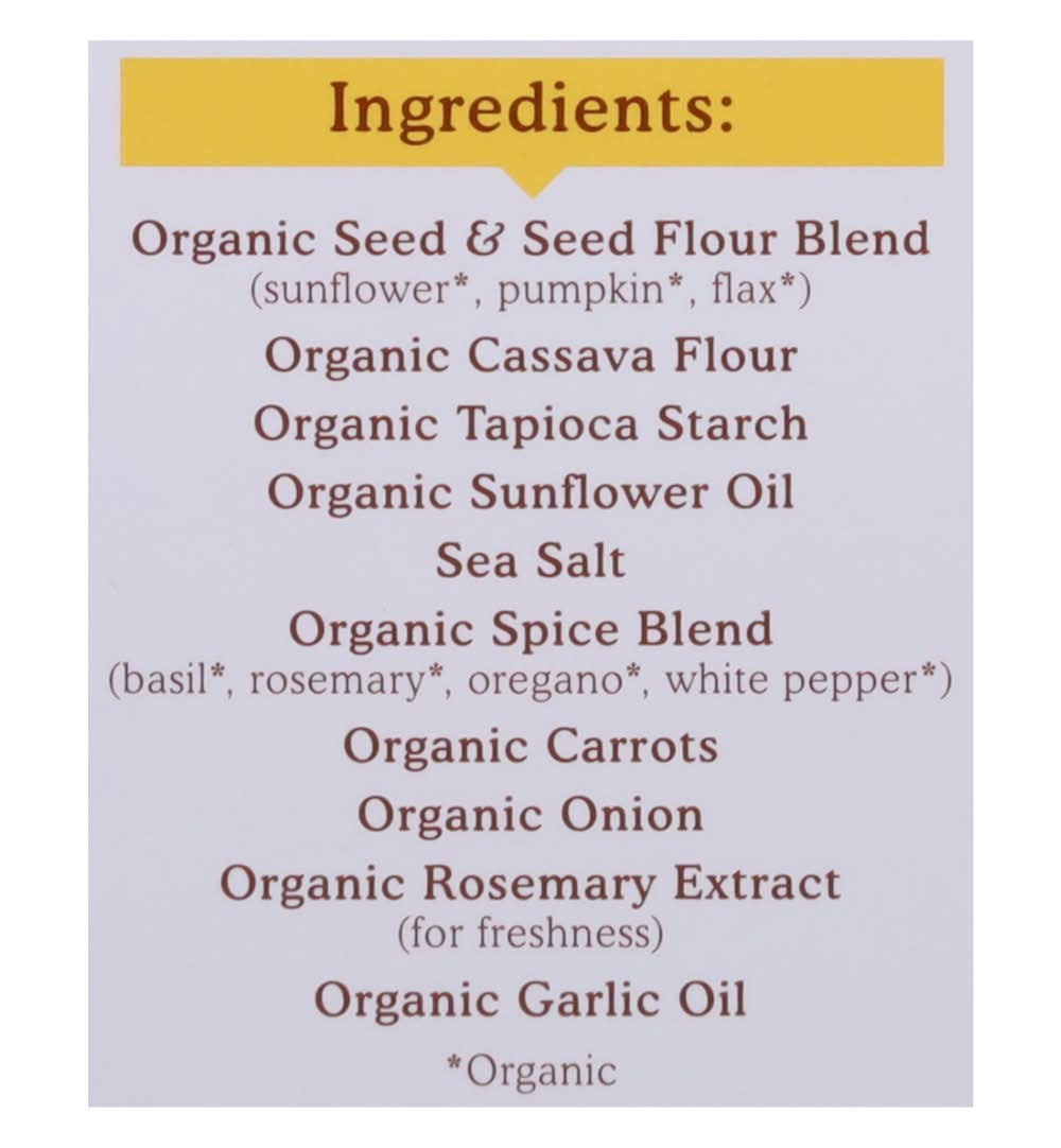 Ingredients: Organic Seed & Seed Flour Blend (Sunflower (Organic), Pumpkin (Organic), Flax (Organic)) Organic Cassava Flour Organic Tapioca Starch Organic Sunflower Oil Sea Salt Organic Spice Blend (Basil (Organic), Rosemary (Organic), Oregano (Organic), White Pepper (Organic)) Organic Carrots Organic Onion Organic Rosemary Extract (for Freshness) Organic Garlic Oil