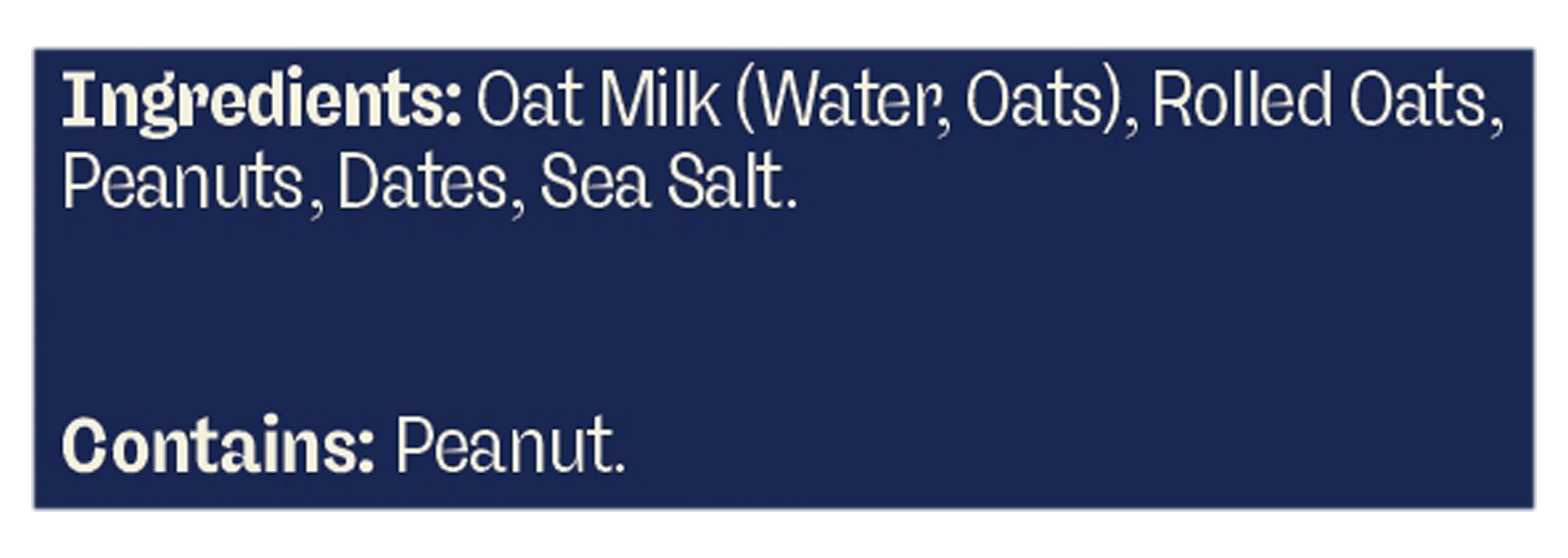 Ingredients: Oat Milk (Water, Oats), Rolled Oats, Peanuts, Dates, Sea Salt Contains: Oat, Tree Nuts, Almonds, Tree Nuts, Coconuts, Milk, Peanuts