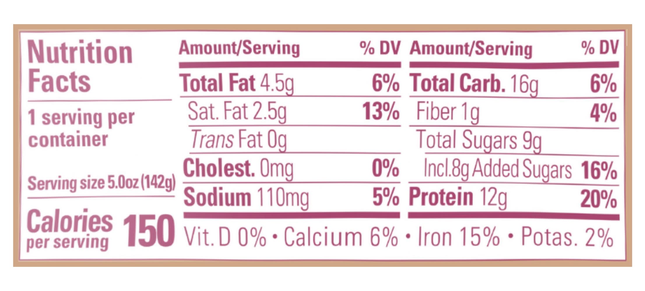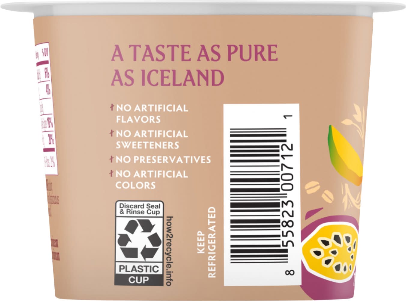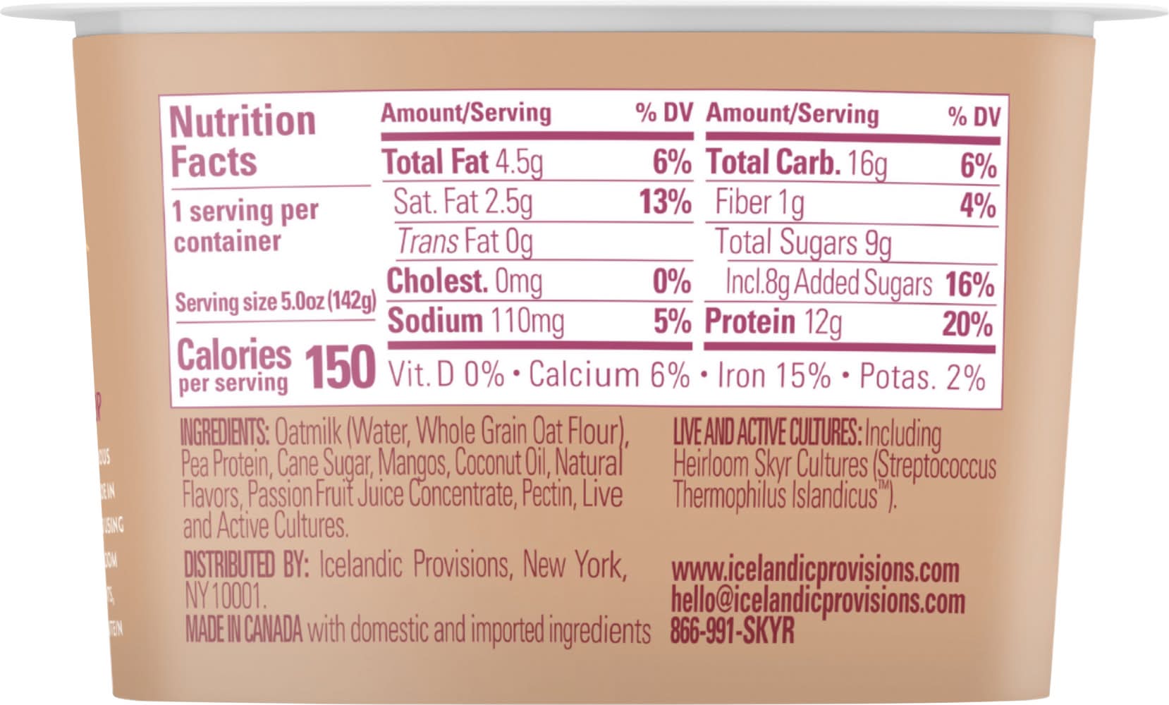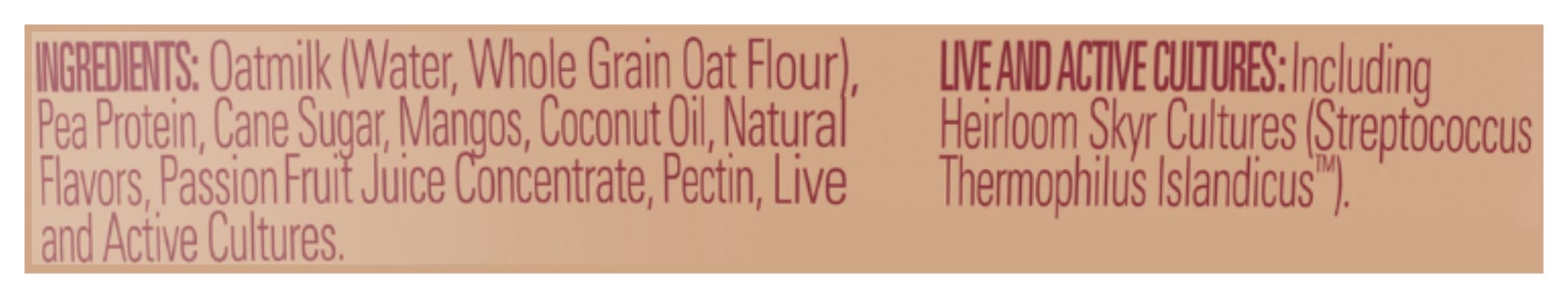 Ingredients: Oatmilk (Water, Whole Grain Oat Flour), Pea Protein, Cane Sugar, Mangos, Coconut Oil, Natural Flavors, Passion Fruit Juice Concentrate, Pectin, Live and Active Cultures. Live and Active Cultures: Including Heirloom Skyr Cultures (Streptococcus Thermophilus Islandicus) Contains: Oat, Tree Nuts, Coconuts