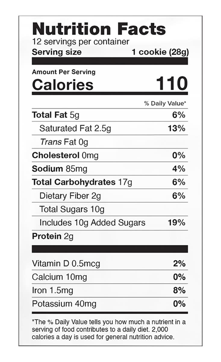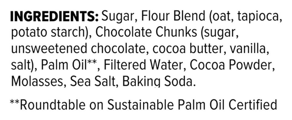 Ingredients: Cane Sugar, Gluten Free Flour Blend (Oat Tapioca Potato Starch), Chocolate Chunks (Sugar Unsweetened Chocolate Cocoa Butter Vanilla Salt), Palm Oil (Sustainably Sourced RSPO Certified), Filtered Water, Cocoa Powder, Molasses, Sea Salt, Baking Soda Contains: Oat, Eggs, Soybeans