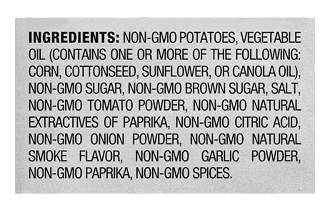 Ingredients: Non-GMO Potatoes, Vegetable Oil (Contains One or More of the Following: Corn, Cottonseed, Sunflower, or Canola Oil), Non-GMO Sugar, Non-GMO Brown Sugar, Salt, Non-GMO Tomato Powder, Non-GMO Natural Extractives of Paprika, Non-GMO Citric Acid, Non-GMO Onion Powder, Non-GMO Natural Smoke Flavor, Non-GMO Garlic Powder, Non-GMO Paprika, Non-GMO Spices Contains: Corn