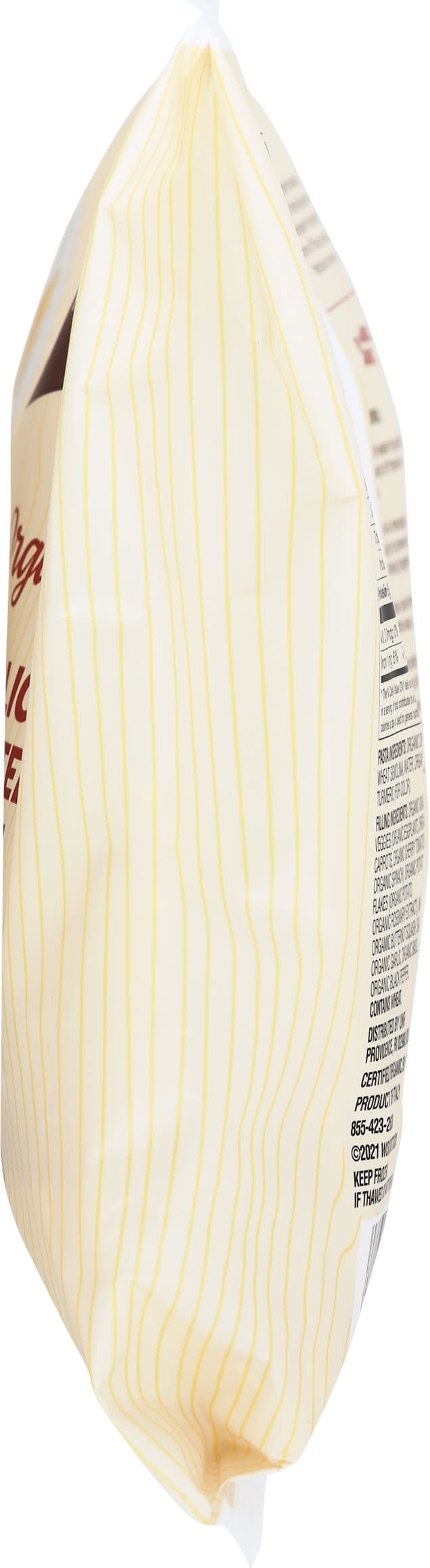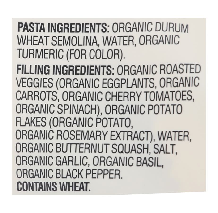Ingredients: Organic Durum Wheat Semolina, Water, Organic Turmeric (for Color). Filling Ingredients: Organic Roasted Veggie (Organic Eggplants, Organic Carrots, Organic Cherry Tomatoes, Organic Spinach), Organic Potato Flakes (Organic Potato, Organic Rosemary Extract), Water, Organic Butternut Squash, Salt, Organic Garlic, Organic Basil, Organic Black Pepper Contains: Wheat, Eggs, Tree Nuts