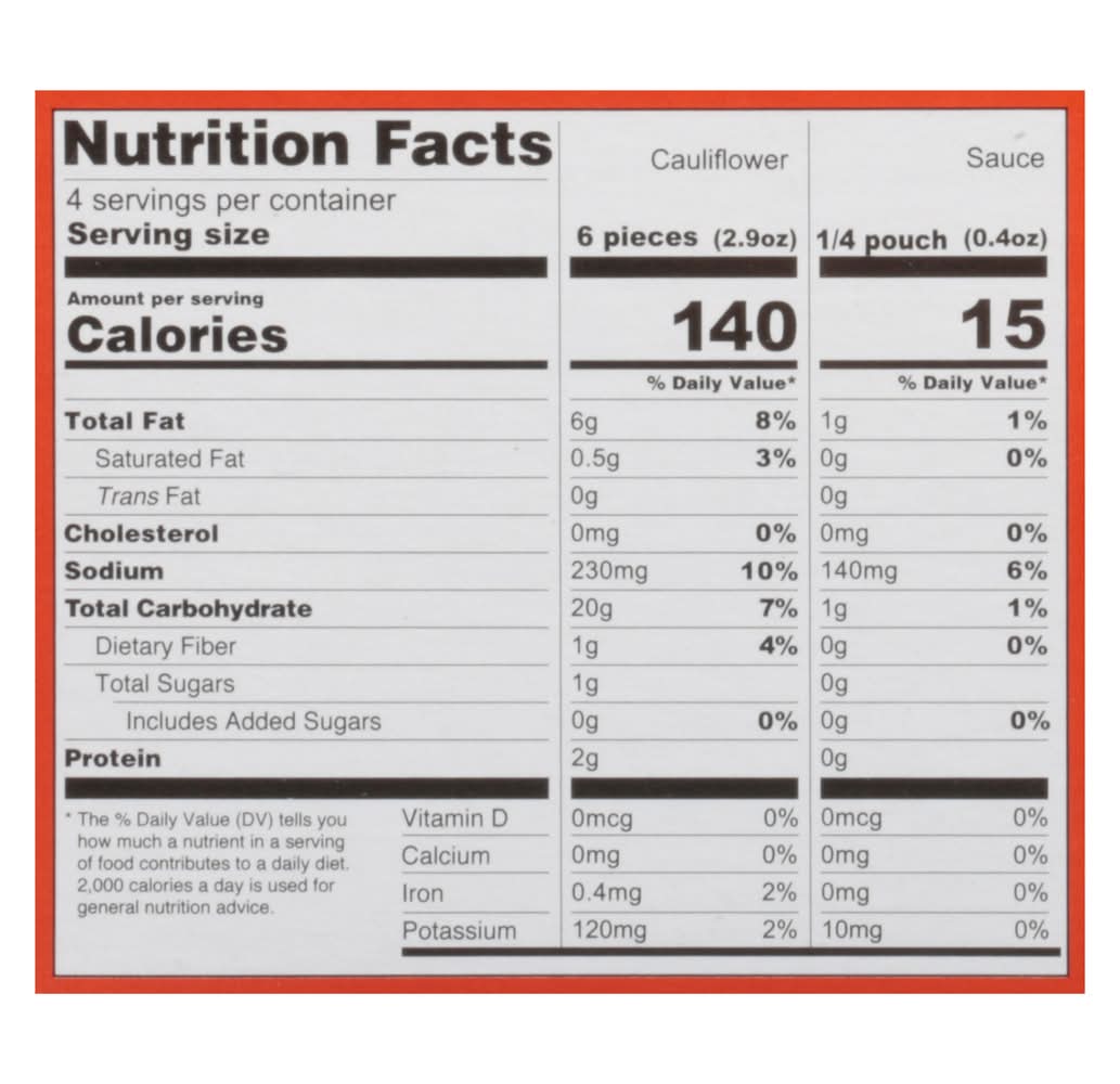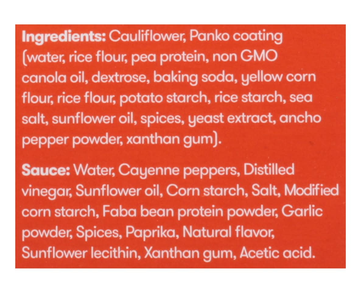 Ingredients: Cauliflower, Panko Coating (Water, Rice Flour, Pea Protein, Non GMO Canola Oil, Dextrose, Baking Soda, Yellow Corn Flour, Rice Flour, Potato Starch, Rice Starch, Sea Salt, Sunflower Oil, Spices, Yeast Extract, Ancho Pepper Powder, Xanthan Gum). Sauce: Water, Cayenne Peppers, Distilled Vinegar, Sunflower Oil, Corn Starch, Salt, Modified Corn Starch, Faba Bean Protein Powder, Garlic Powder, Spices, Paprika, Natural Flavor, Sunflower Lecithin, Xanthan Gum, Acetic Acid Contains: Corn