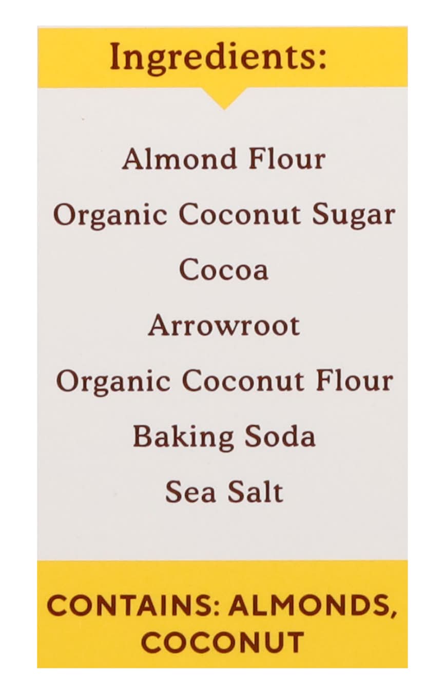 Ingredients: Almond Flour, Organic Coconut Sugar, Cocoa, Arrowroot, Organic Coconut Flour, Baking Soda, Sea Salt