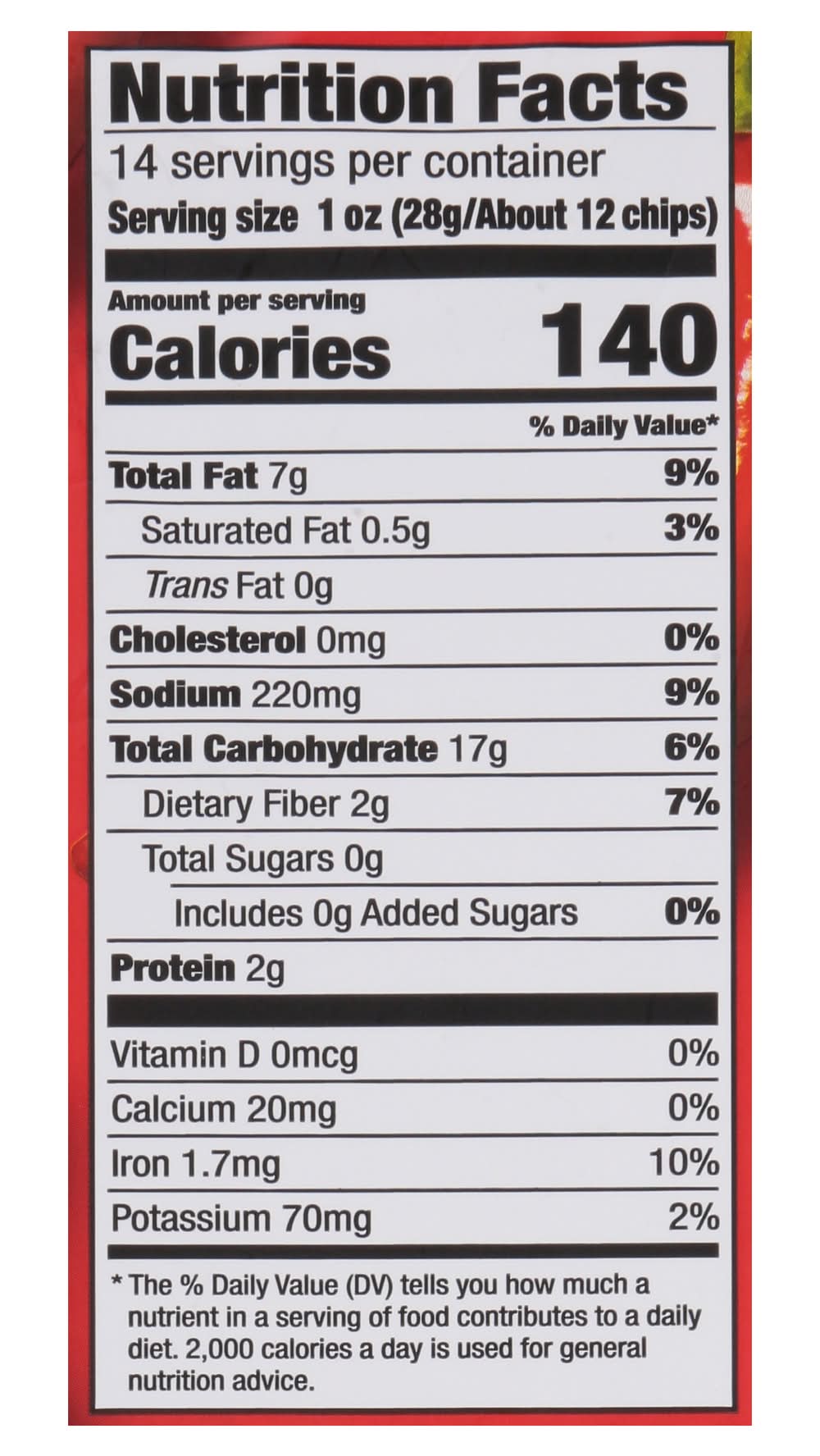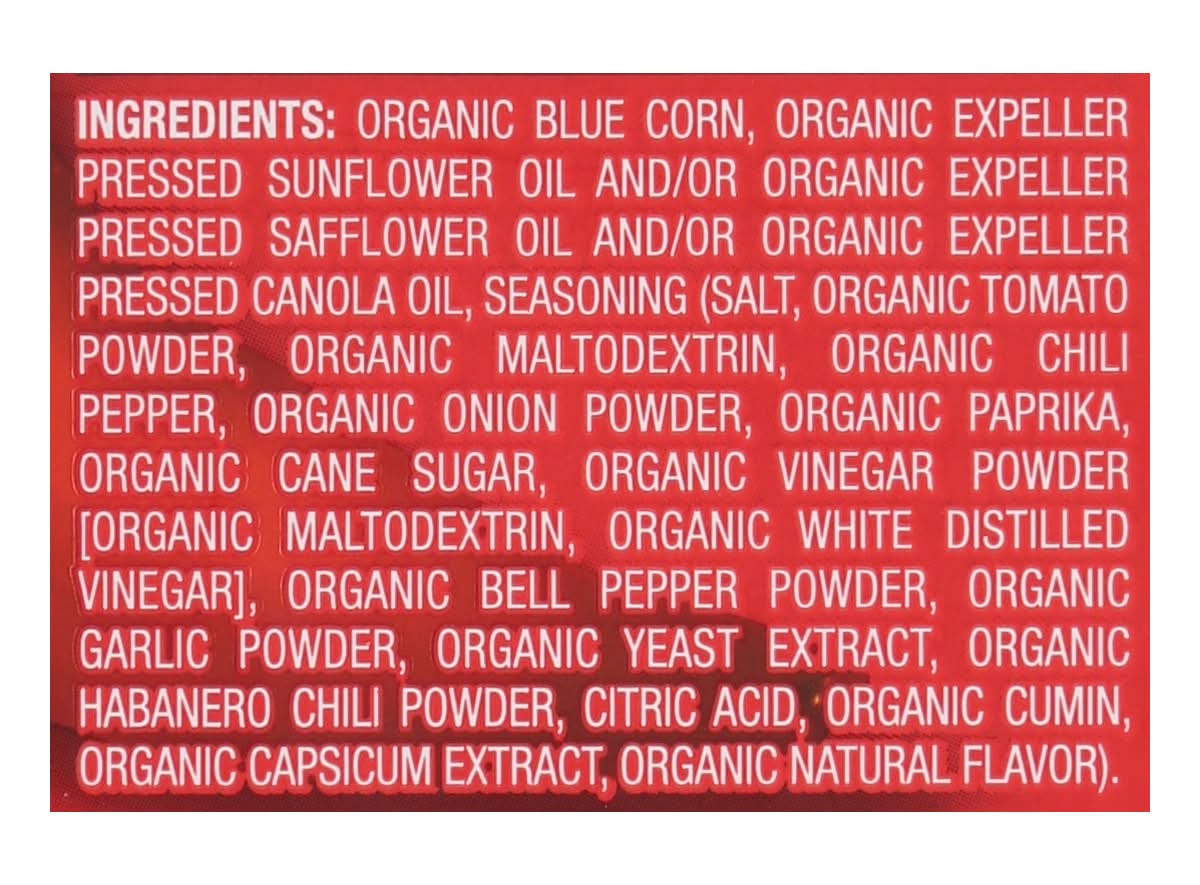Ingredients: Organic Blue Corn, Organic Expeller Pressed Sunflower Oil and/or Organic Expeller Pressed Safflower Oil and/or Organic Expeller Pressed Canola Oil, Seasoning (Salt, Organic Tomato Powder, Organic Maltodextrin, Organic Chili Pepper, Organic Onion Powder, Organic Paprika, Organic Cane Sugar, Organic Vinegar Powder [Organic Maltodextrin, Organic White Distilled Vinegar], Organic Bell Pepper Powder, Organic Garlic Powder, Organic Yeast Extract, Organic Habanero Chili Powder, Citric Acid, Organic Cumin, Organic Capsicum Extract, Organic Natural Flavor)