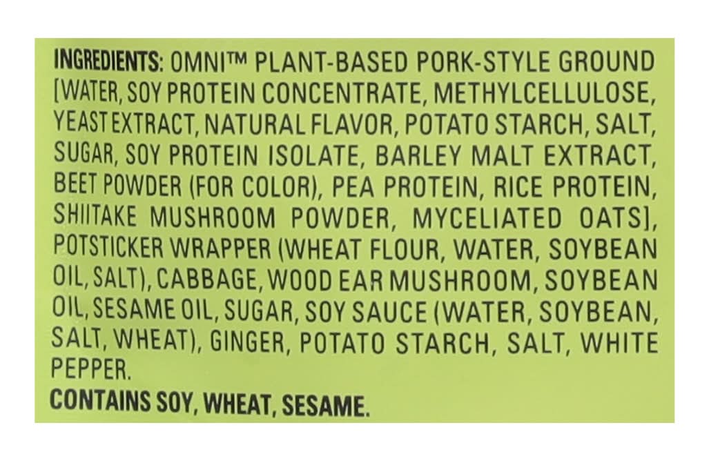 Ingredients: Omni Plant-Based Pork-Style Ground [Water, Soy Protein Concentrate, Methylcellulose, Yeast Extract, Natural Flavor, Potato Starch, Salt, Sugar, Soy Protein Isolate, Barley Malt Extract, Beet Powder (for Color), Pea Protein, Rice Protein, Shiitake Mushroom Powder, Myceliated Oats], Potsticker Wrapper (Wheat Flour, Water, Soybean Oil, Salt), Cabbage, Wood Ear Mushroom, Soybean Oil, Sesame Oil, Sugar, Soy Sauce (Water, Soybean, Salt, Wheat), Ginger, Potato Starch, Salt, White Pepper Contains: Soybeans, Wheat, Sesame, Barley, Oat