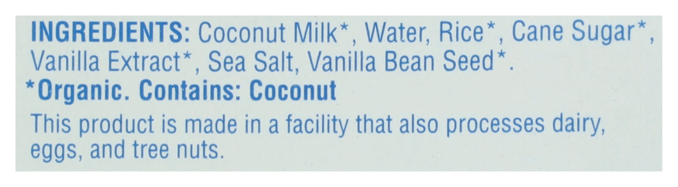 Ingredients: Coconut Milk (Organic), Water, Rice (Organic), Cane Sugar (Organic), Vanilla Extract (Organic), Sea Salt, Vanilla Bean Seed (Organic) Contains: Tree Nuts, Coconuts, Milk, Eggs, Tree Nuts