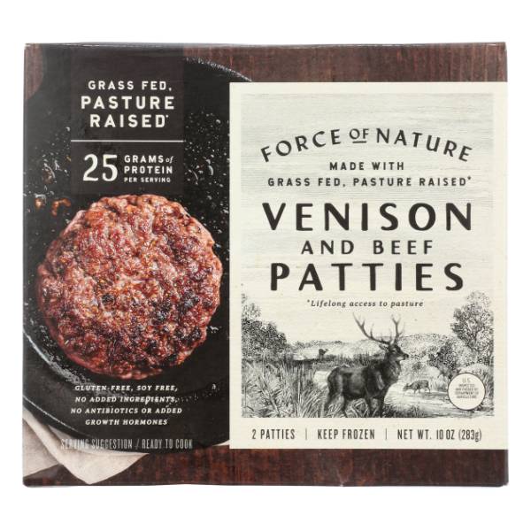 25 grams of protein per serving. Gluten free. Soy free. Grass fed, pasture raised. No added ingredients, no antibiotics or added growth hormones. Venison and beef - patties. These Venison and Beef patties are sure to become a favorite for their incredible flavor that adds some variety to the weekly menu. A wild game protein once accessible only to hunters, Force of Nature now makes enjoying the diversity present in nature's bounty more accessible than ever. U.S. inspected and passed by Department of Agriculture