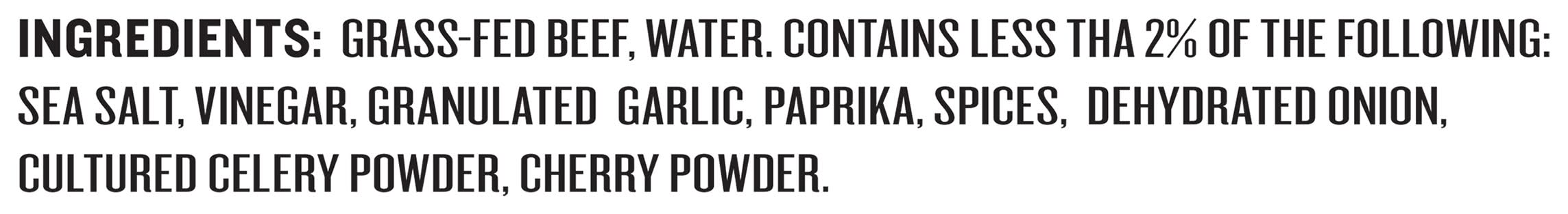 Ingredients: Grass-Fed Beef (Beef Never Administered Antibiotics, Added Growth Hormones or Animal By-Products), Water, Contains Less than 2% of the Following: Sea Salt, Paprika, Dehydrated Onion, Spices, Nutmeg Oil, Celery Powder Contains: Celery